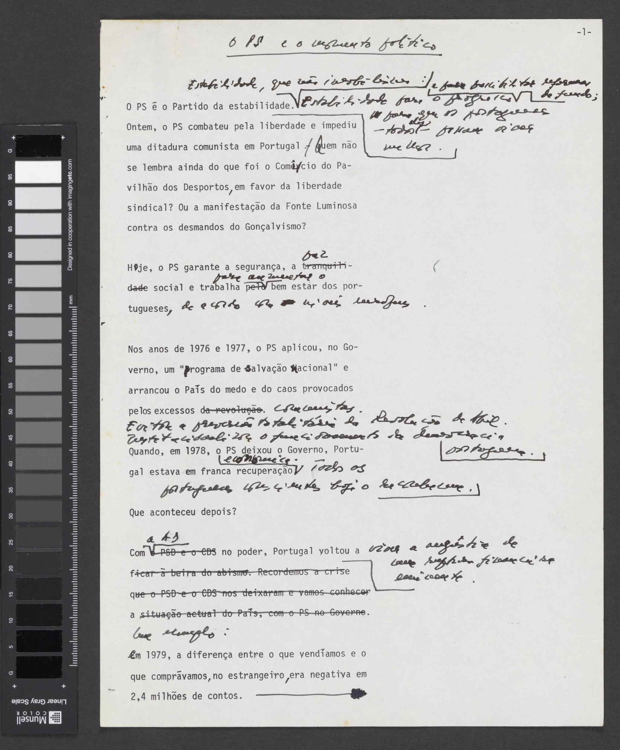 Instituição: Fundação Mário Soares e Maria Barroso Pasta: 00115.001.002Título: O PS e o momento políticoAssunto: Discurso de Mário Soares sobre a situação política e sobre a estratégia do PS.Data: s.d.Observações: Manuscrito datilografado com correções.Fundo: AMS - Arquivo Mário SoaresTipo Documental: DocumentosDireitos: A publicação, total ou parcial, deste documento exige prévia autorização da entidade detentora.