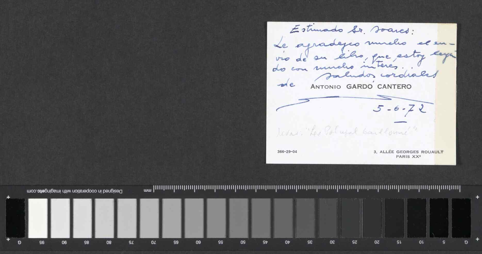 Instituição: Fundação Mário Soares e Maria Barroso Pasta: 00662.001.019Assunto: Agradecimento do livro Le Portugal Baillonné.Remetente: Antonio Gardó CanteroDestinatário: Mário SoaresData: segunda, 5 de junho de 1972Fundo: AMS - Arquivo Mário SoaresTipo Documental: CorrespondenciaDireitos: A publicação, total ou parcial, deste documento exige prévia autorização da entidade detentora.