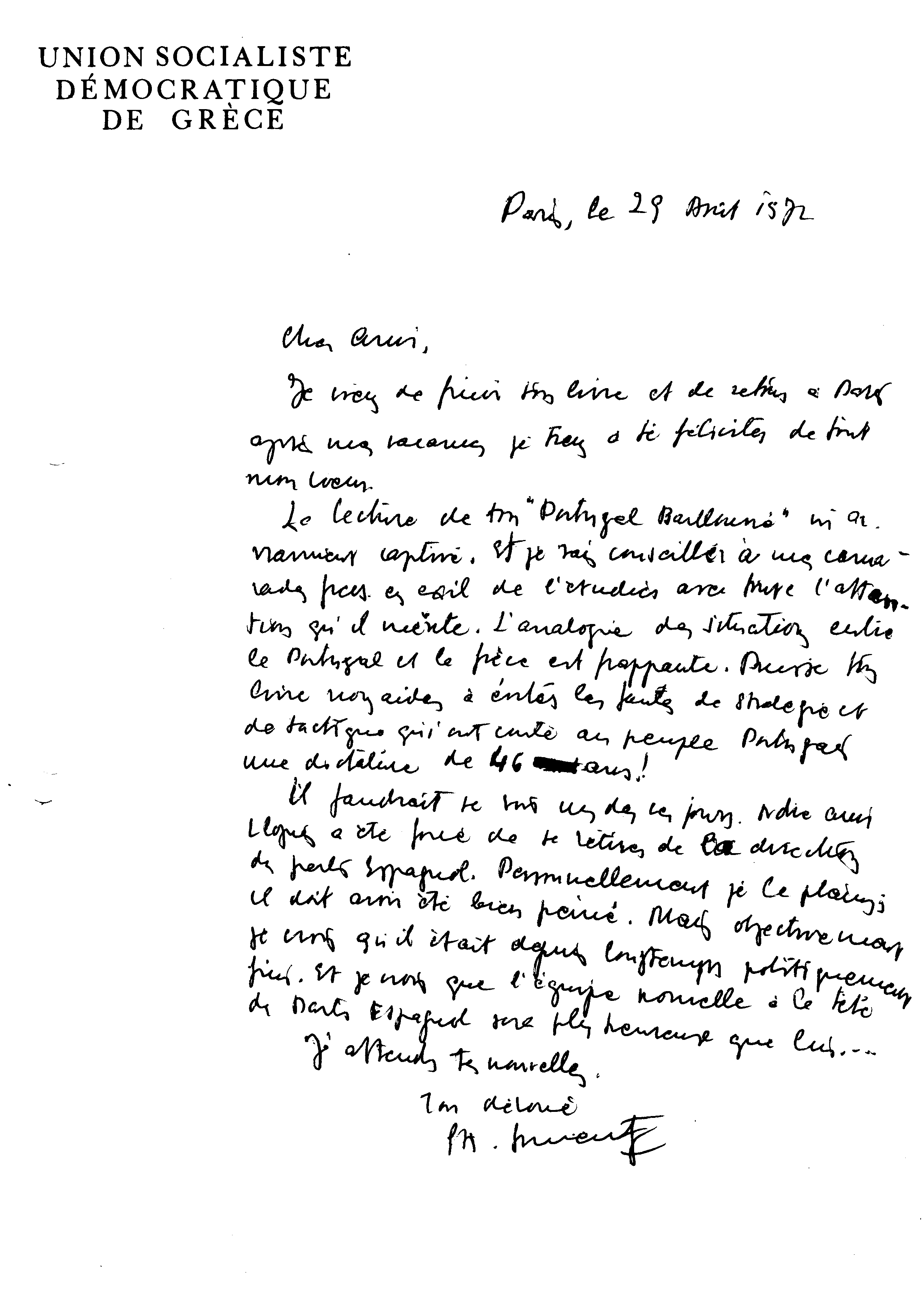 Instituição: Fundação Mário Soares e Maria Barroso Pasta: 00664.001.007Assunto: Livro Le Portugal Baillonné; paralelo situação Grécia e Portugal.Remetente: M. Stratis D. Someritis, União Socialista Democrática da GréciaDestinatário: Mário SoaresData: sábado, 29 de abril de 1972Fundo: AMS - Arquivo Mário SoaresTipo Documental: CorrespondenciaDireitos: A publicação, total ou parcial, deste documento exige prévia autorização da entidade detentora.