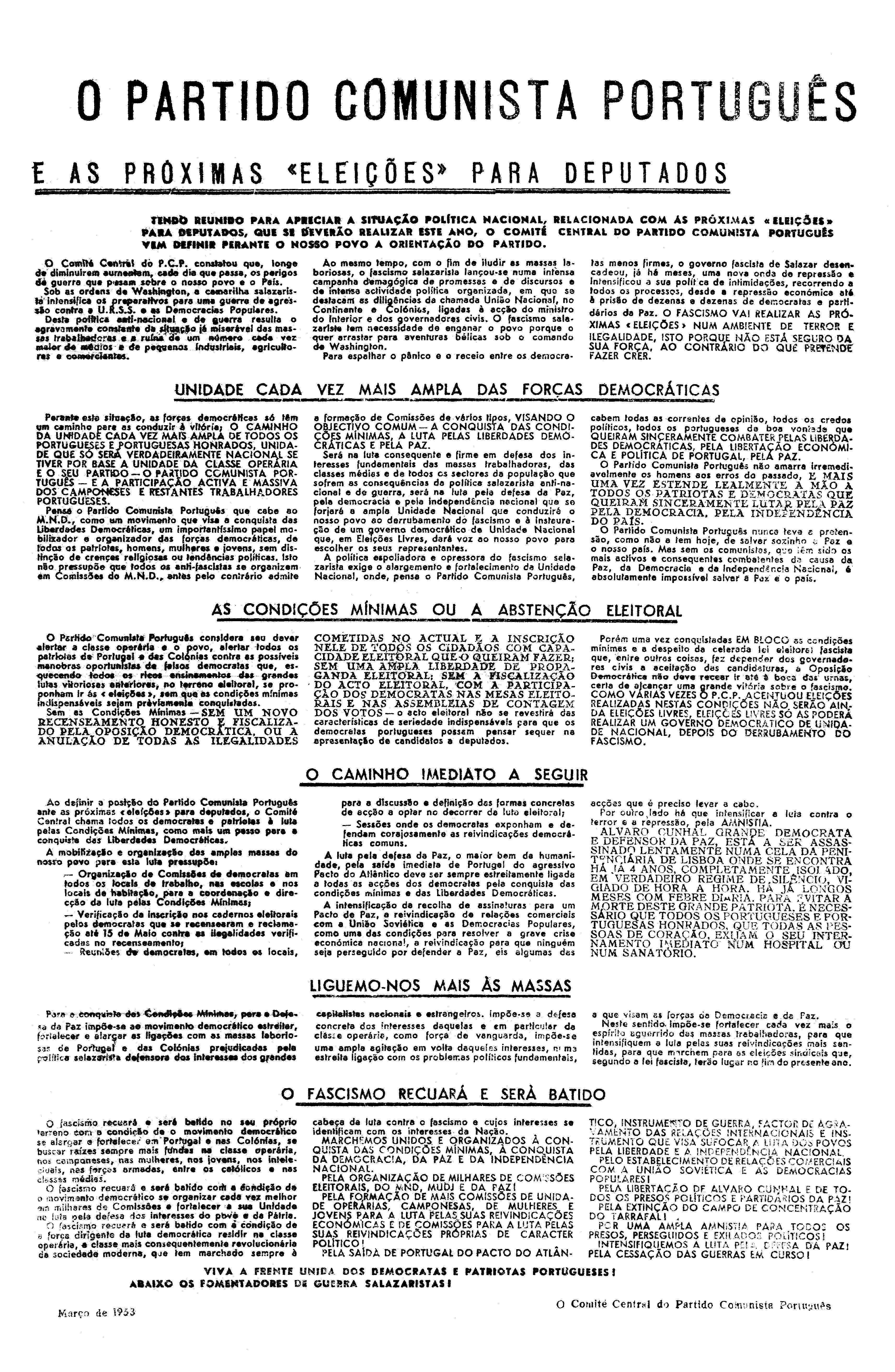 Instituição: Fundação Mário Soares e Maria Barroso Pasta: 02597.001.017Título: O Partido Comunista Português e as Próximas «Eleições» para DeputadosAssunto: Comunicado do Comité Central do PCP sobre a posição do partido face às eleições para deputados.Data: Março de 1953Fundo: AMS - Arquivo Mário Soares / DMJ - Documentos 50º MUD JuvenilTipo Documental: DocumentosDireitos: A publicação, total ou parcial, deste documento exige prévia autorização da entidade detentora.