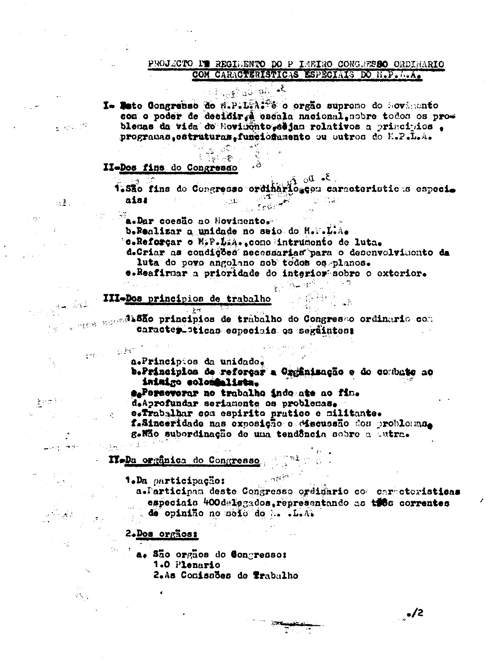 Instituição: Fundação Mário Soares e Maria Barroso Pasta: 04339.002.020Título: MPLA - 1º. Congresso - Projecto de RegimentoAssunto: Projecto de Regimento do Primeiro Congresso Ordinário com características especiais do MPLA.Data: 1974Fundo: Arquivo Mário Pinto de AndradeTipo Documental: DocumentosDireitos: A publicação, total ou parcial, deste documento exige prévia autorização da entidade detentora.