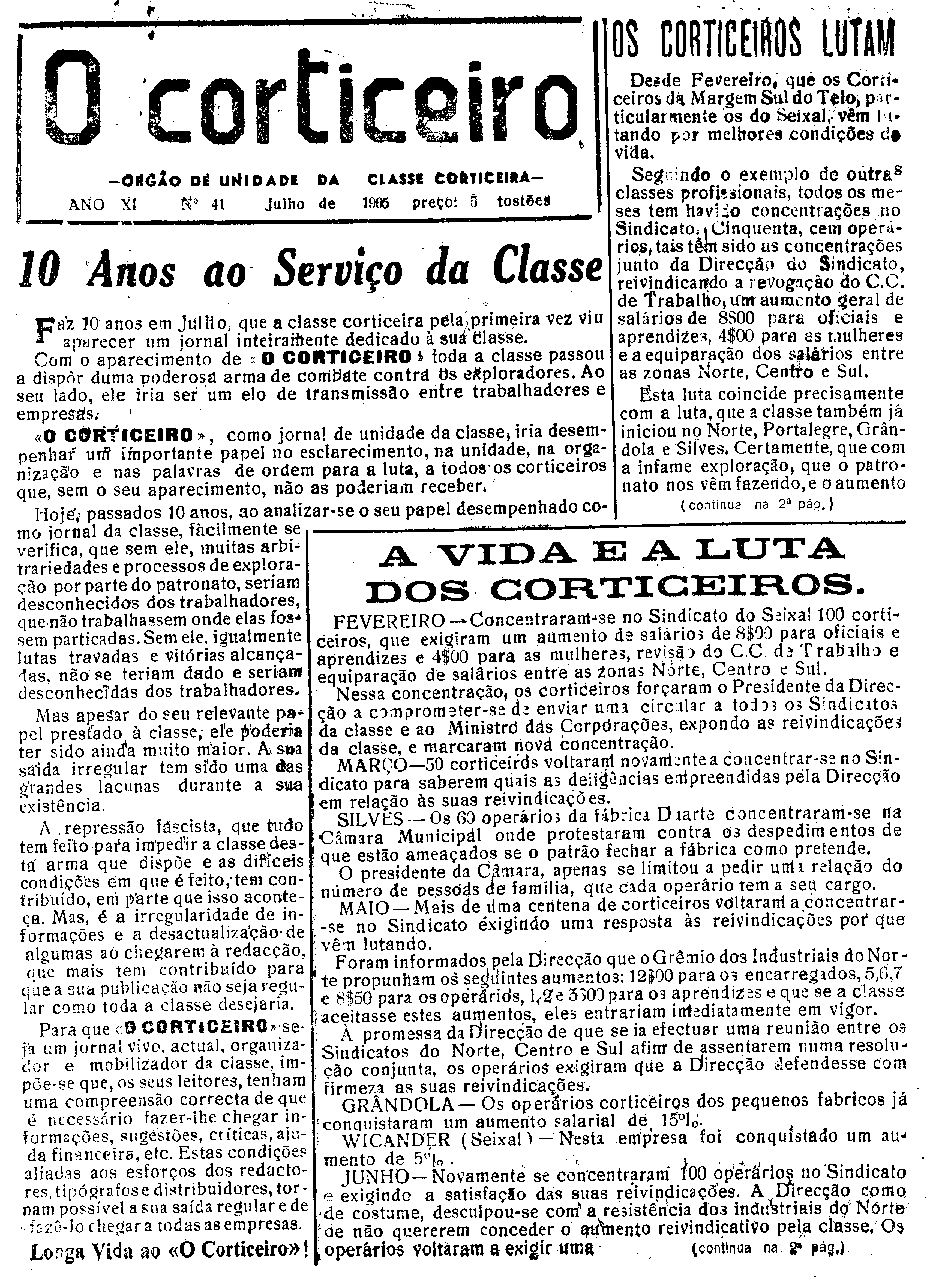 Instituição: Fundação Mário Soares e Maria Barroso Pasta: 04435.317Título: O CorticeiroAssunto: Órgão de Unidade da Classe CorticeiraNúmero: 041Ano: XIData: Julho de 1965Fundo: DST - Documentos Souto TeixeiraTipo Documental: IMPRENSADireitos: A publicação, total ou parcial, deste documento exige prévia autorização da entidade detentora.