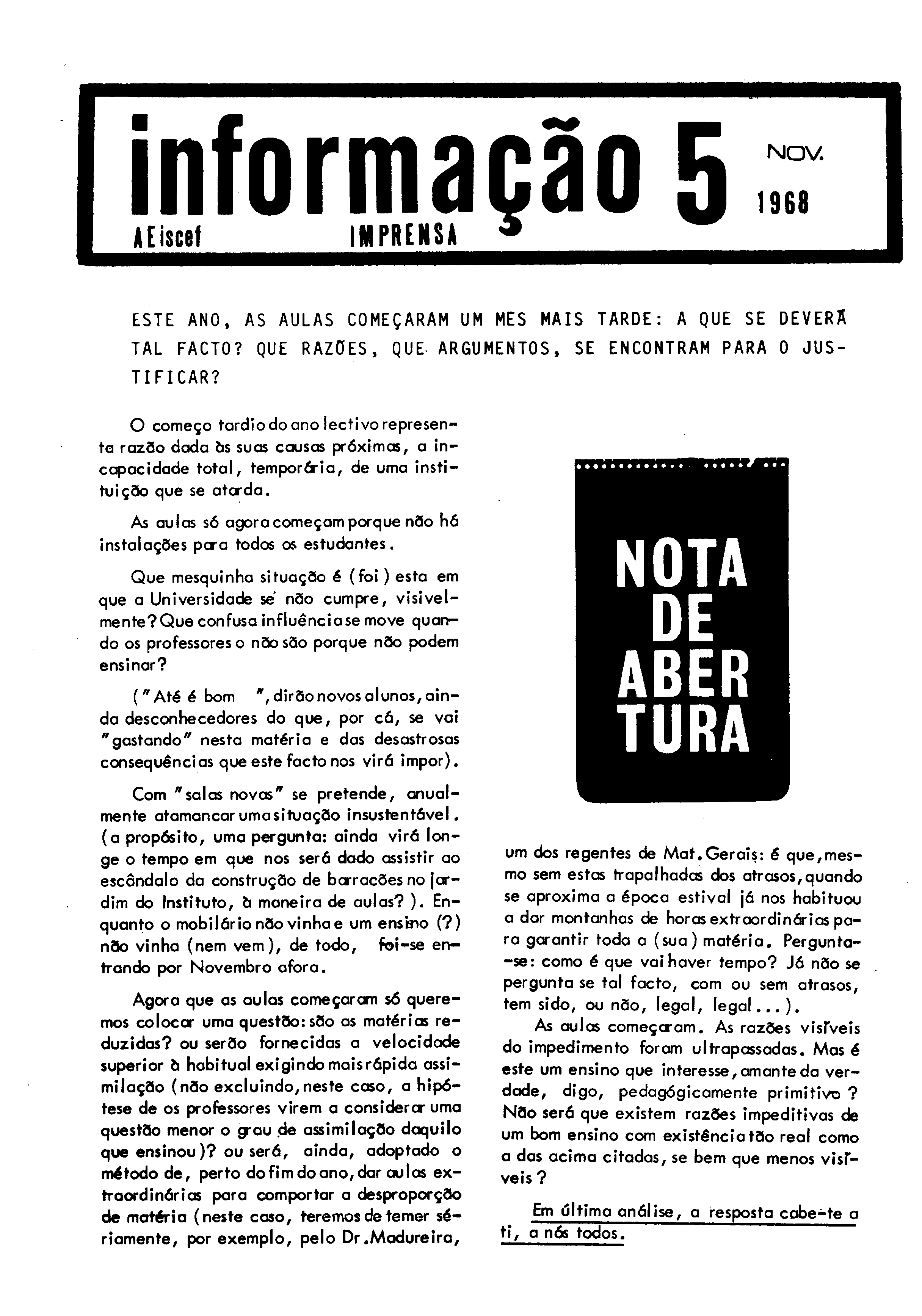 Instituição: Fundação Mário Soares e Maria Barroso Pasta: 04456.014.001Título: Informação n.º 5 - Boletim da Associação de Estudantes do ISCEFAssunto: Informação n.º 5 - Boletim da Associação de Estudantes do ISCEFData: Novembro de 1968Fundo: DML - Documentos Maria Luís Rocha PintoTipo Documental: DocumentosDireitos: A publicação, total ou parcial, deste documento exige prévia autorização da entidade detentora.