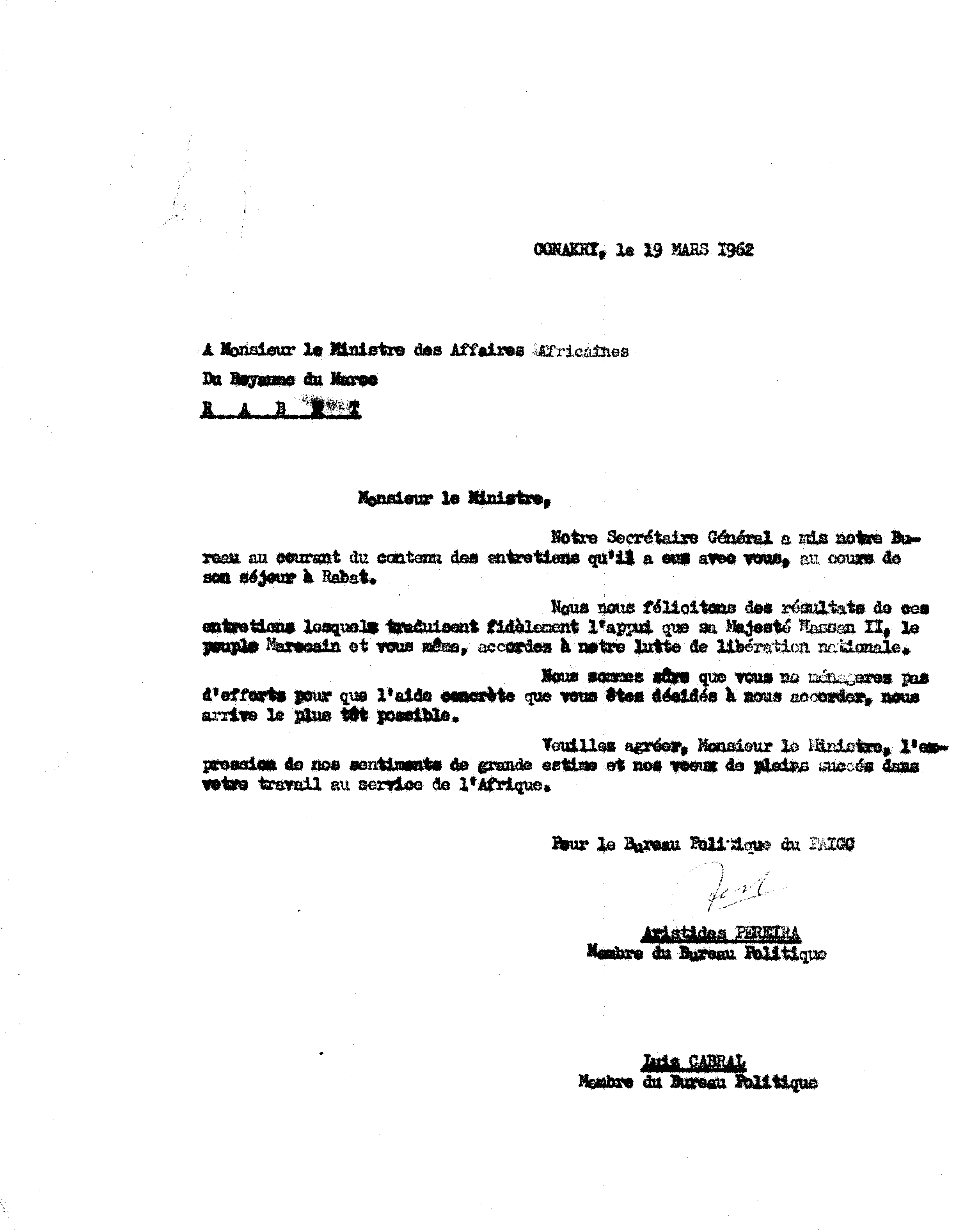 Instituição: Fundação Mário Soares e Maria Barroso Pasta: 04617.080.024Assunto: Felicitações pelos resultados do encontro entre Amílcar Cabral e o Rei Hassan II, em Rabat.Remetente: Aristides Pereira, Luís CabralDestinatário: Ministro dos Assuntos Africanos do Reino de MarrocosData: Segunda, 19 de Março de 1962Observações: Doc. incluído no dossier intitulado Correspondência dactilografada 1962 (exterior).Fundo: DAC - Documentos Amílcar CabralTipo Documental: CorrespondenciaDireitos: A publicação, total ou parcial, deste documento exige prévia autorização da entidade detentora.