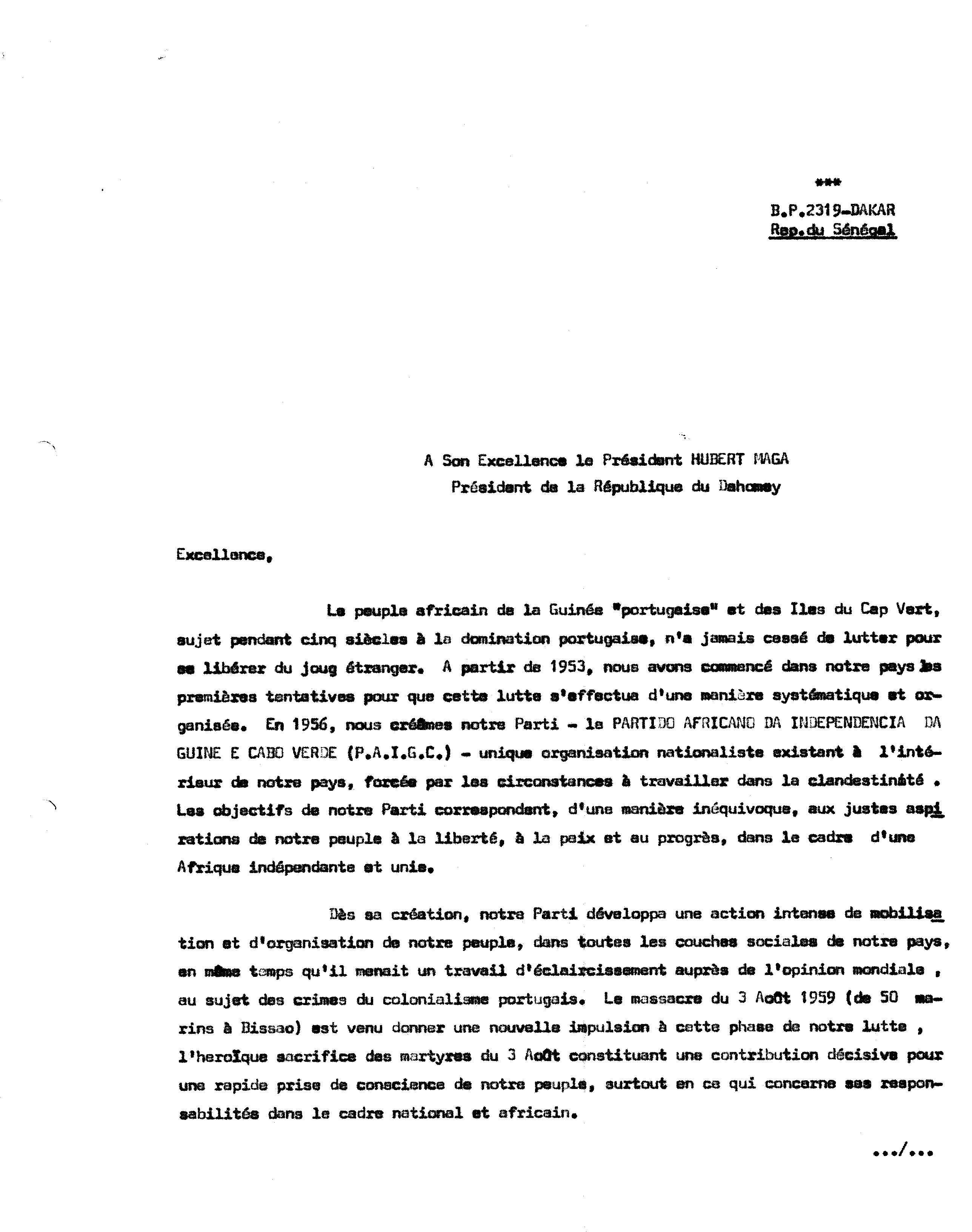Instituição: Fundação Mário Soares e Maria Barroso Pasta: 04621.113.007Assunto: Desenvolvimento de acção intensa de mobilização e organização do povo com o objectivo de se libertar da dominação portuguesa.Remetente: Amílcar CabralDestinatário: Hubert MagaData: Quinta, 16 de Agosto de 1962Observações: Doc. incluído no dossier intitulado Correspondência 1961-1963 (Mensagens aos Chefes de Estado Africanos).Fundo: DAC - Documentos Amílcar CabralTipo Documental: CorrespondenciaDireitos: A publicação, total ou parcial, deste documento exige prévia autorização da entidade detentora.