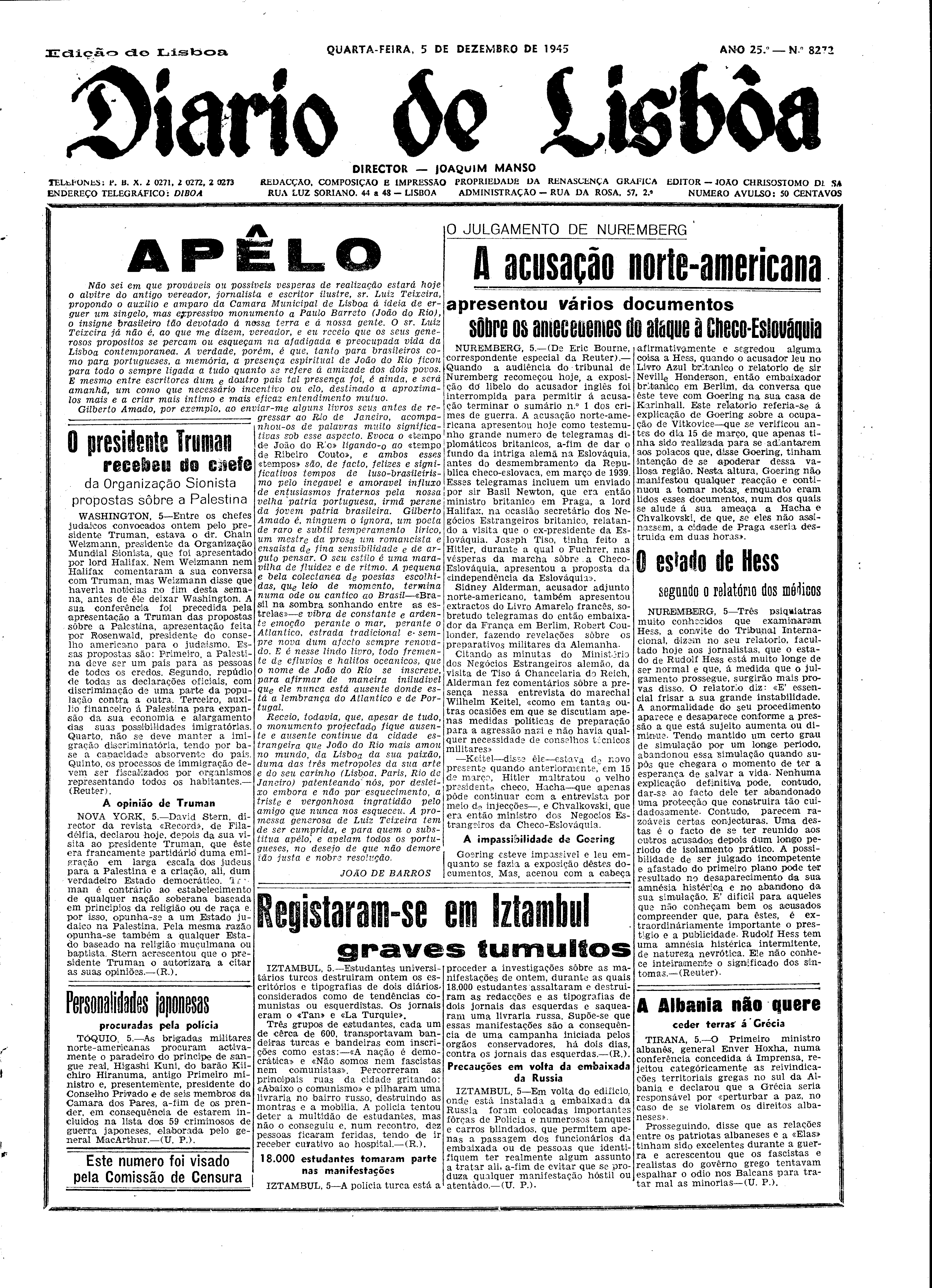 Instituição: Fundação Mário Soares e Maria Barroso Pasta: 05777.041.10488Título: Diário de LisboaNúmero: 8272Ano: 25Data: Quarta, 5 de Dezembro de 1945Directores: Director: Joaquim MansoEdição: 2ª ediçãoObservações: Edição de Lisboa.Fundo: DRR - Documentos Ruella RamosTipo Documental: IMPRENSADireitos: A publicação, total ou parcial, deste documento exige prévia autorização da entidade detentora.