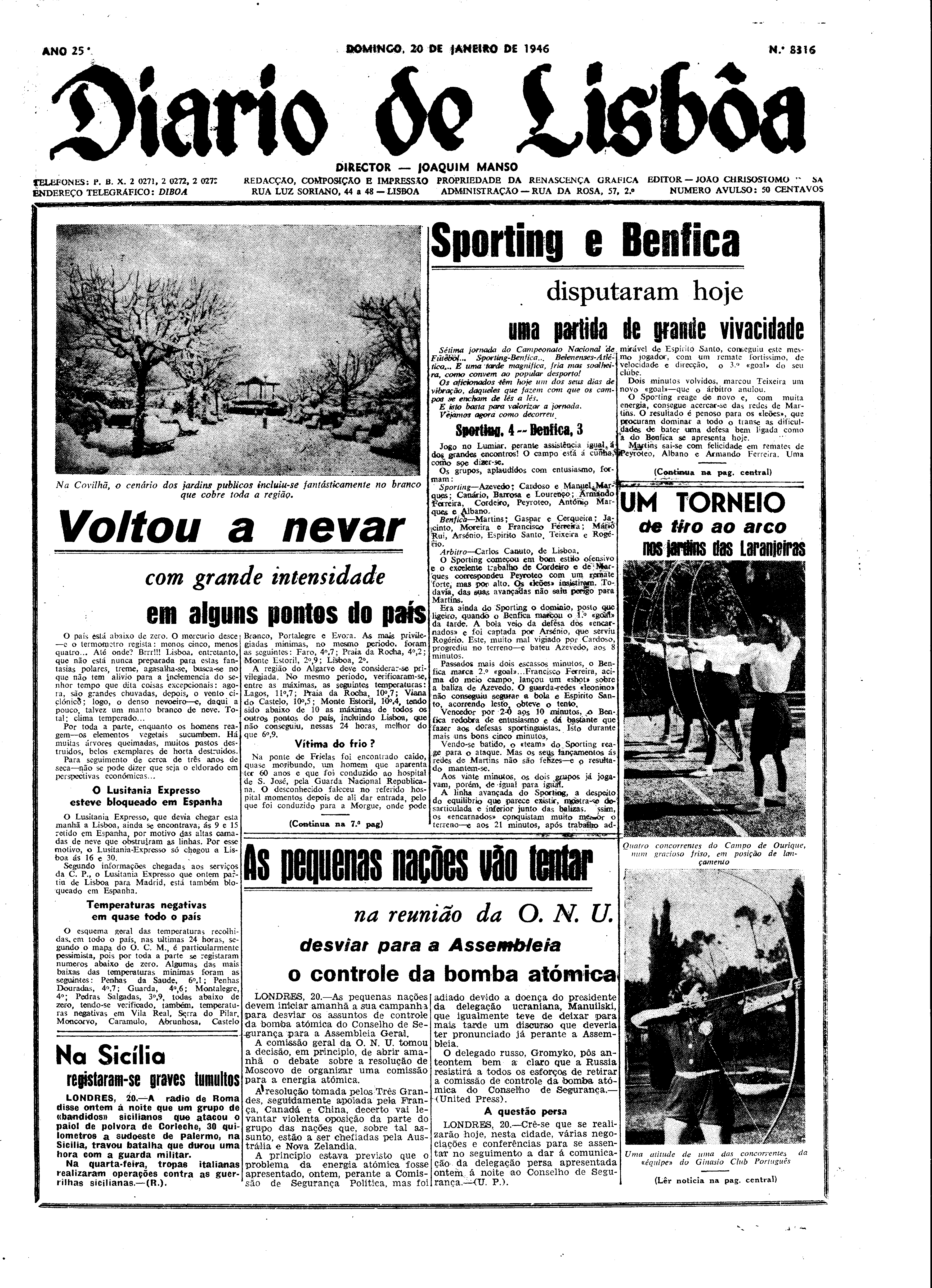 Instituição: Fundação Mário Soares e Maria Barroso Pasta: 05778.042.10570Título: Diário de LisboaNúmero: 8316Ano: 25Data: Domingo, 20 de Janeiro de 1946Directores: Director: Joaquim MansoEdição: 2ª ediçãoFundo: DRR - Documentos Ruella RamosTipo Documental: IMPRENSADireitos: A publicação, total ou parcial, deste documento exige prévia autorização da entidade detentora.