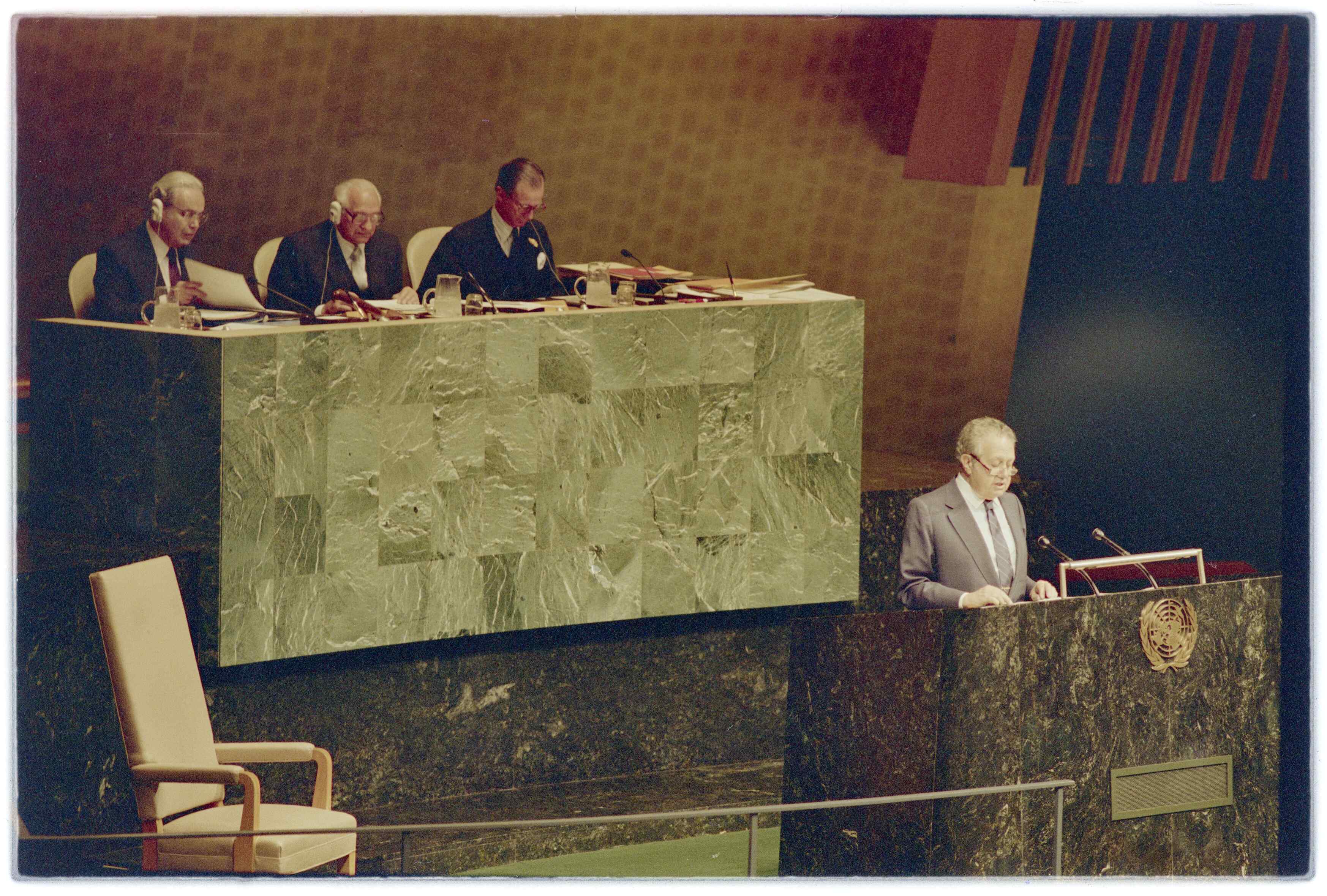 Instituição: Fundação Mário Soares e Maria Barroso Pasta: 06420.053.001Assunto: O Presidente da República Mário Soares discursando perante a Assembleia Geral das Nações Unidas, na terceira sessão especial dedicada ao Desarmamento.Autor: Alfredo CunhaData: segunda, 6 de junho de 1988Opaco/Transparente: TransparenteNegativo/Positivo: NegativoPB/Cor: CorAutor da reprodução: António CoelhoFundo: Mário SoaresTipo Documental: FotografiasDireitos: A publicação, total ou parcial, deste documento exige prévia autorização da entidade detentora.