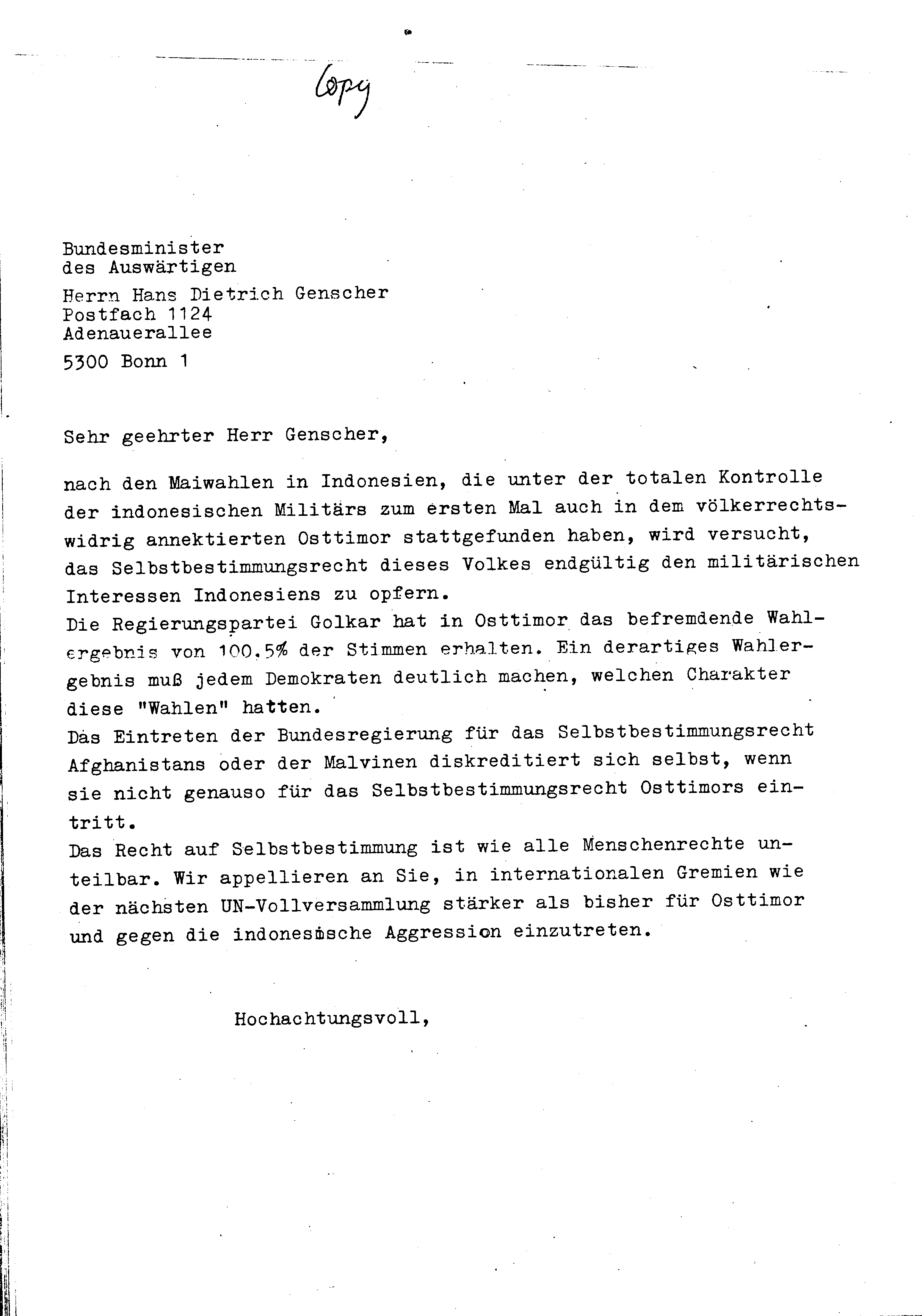 Instituição: Arquivo & Museu da Resistência Timorense Pasta: 06455.013Assunto: Carta defendendo a auto-determinação de Timor-Leste, utilizando as Nações Unidas, e censurando a agressão militar da Indonésia ao povo de Timor-Leste.Remetente: Não identificadoDestinatário: Hans Dietrich Genscher, Ministro dos Negócios Estrangeiros da República Federal Alemã (Bundesminister Auswärtigen)Data: c. 1980Observações: Documento em língua alemãFundo: Arquivo da Resistência Timorense - TAPOLTipo Documental: CorrespondenciaDireitos: A publicação, total ou parcial, deste documento exige prévia autorização da entidade detentora.