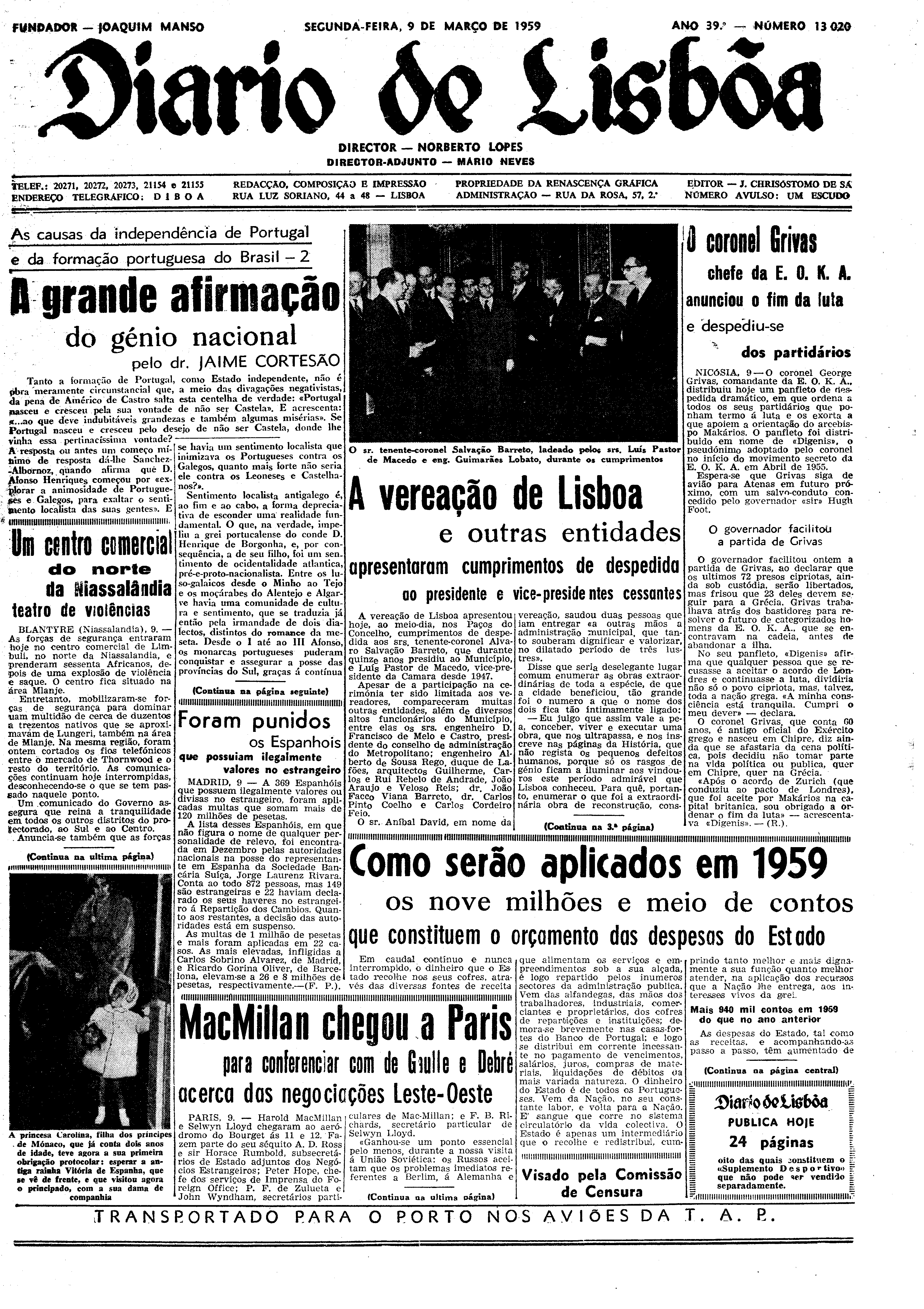Instituição: Fundação Mário Soares e Maria Barroso Pasta: 06534.072.16178Título: Diário de LisboaNúmero: 13020Ano: 39Data: Segunda, 9 de Março de 1959Directores: Director: Norberto Lopes; Director Adjunto: Mário NevesObservações: Inclui supl. "Desportos".Fundo: DRR - Documentos Ruella RamosTipo Documental: IMPRENSADireitos: A publicação, total ou parcial, deste documento exige prévia autorização da entidade detentora.