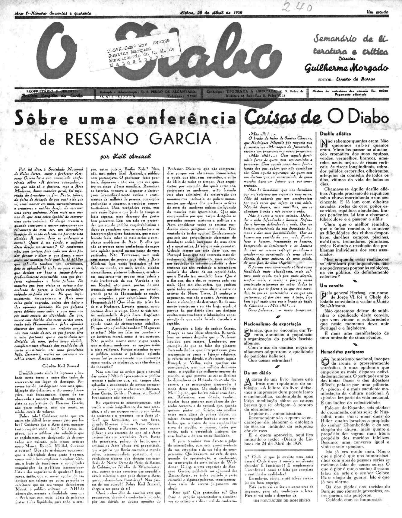 Instituição: Fundação Mário Soares e Maria Barroso Pasta: 06665.000.50240Título: O DiaboNúmero: 240Ano: VData: Sábado, 29 de Abril de 1939Directores: Guilherme MorgadoFundo: DLT - Documentos Luís TrindadeTipo Documental: IMPRENSADireitos: A publicação, total ou parcial, deste documento exige prévia autorização da entidade detentora.