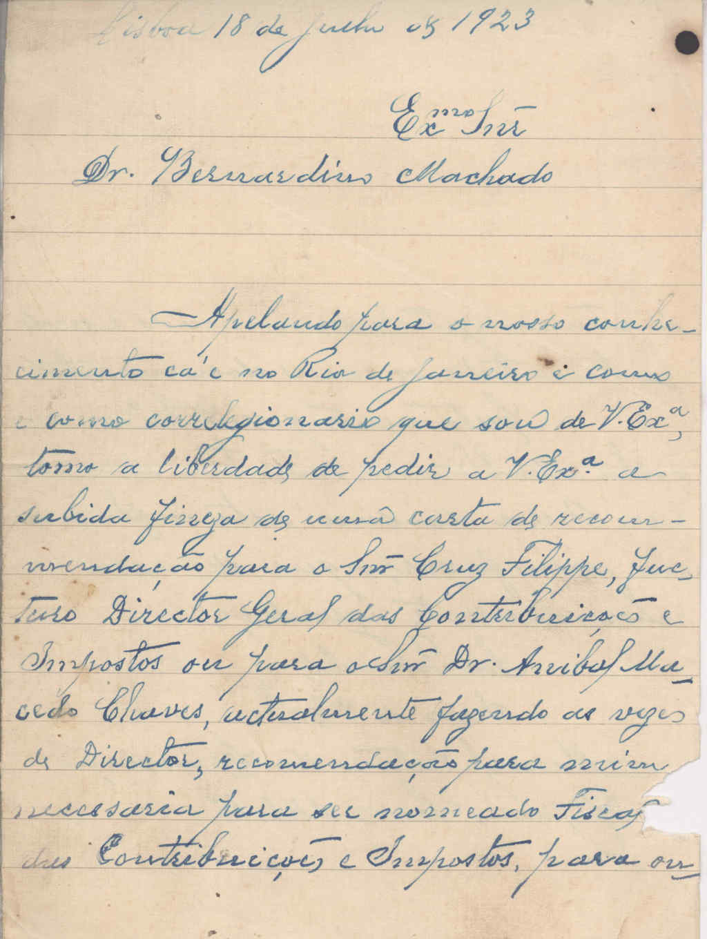 Instituição: Fundação Mário Soares e Maria Barroso Pasta: 06726.153Assunto: Solicita uma carta de recomendação para Cruz Filipe, futuro Director Geral das Contribuições e Impostos, ou para Aníbal Macedo Alves, Director interino, no sentido de obter a nomeação de fiscal.Remetente: Manuel António da ConceiçãoDestinatário: Bernardino MachadoData: Segunda, 18 de Junho de 1923Fundo: DBG - Documentos Bernardino MachadoTipo Documental: CorrespondenciaDireitos: A publicação, total ou parcial, deste documento exige prévia autorização da entidade detentora.