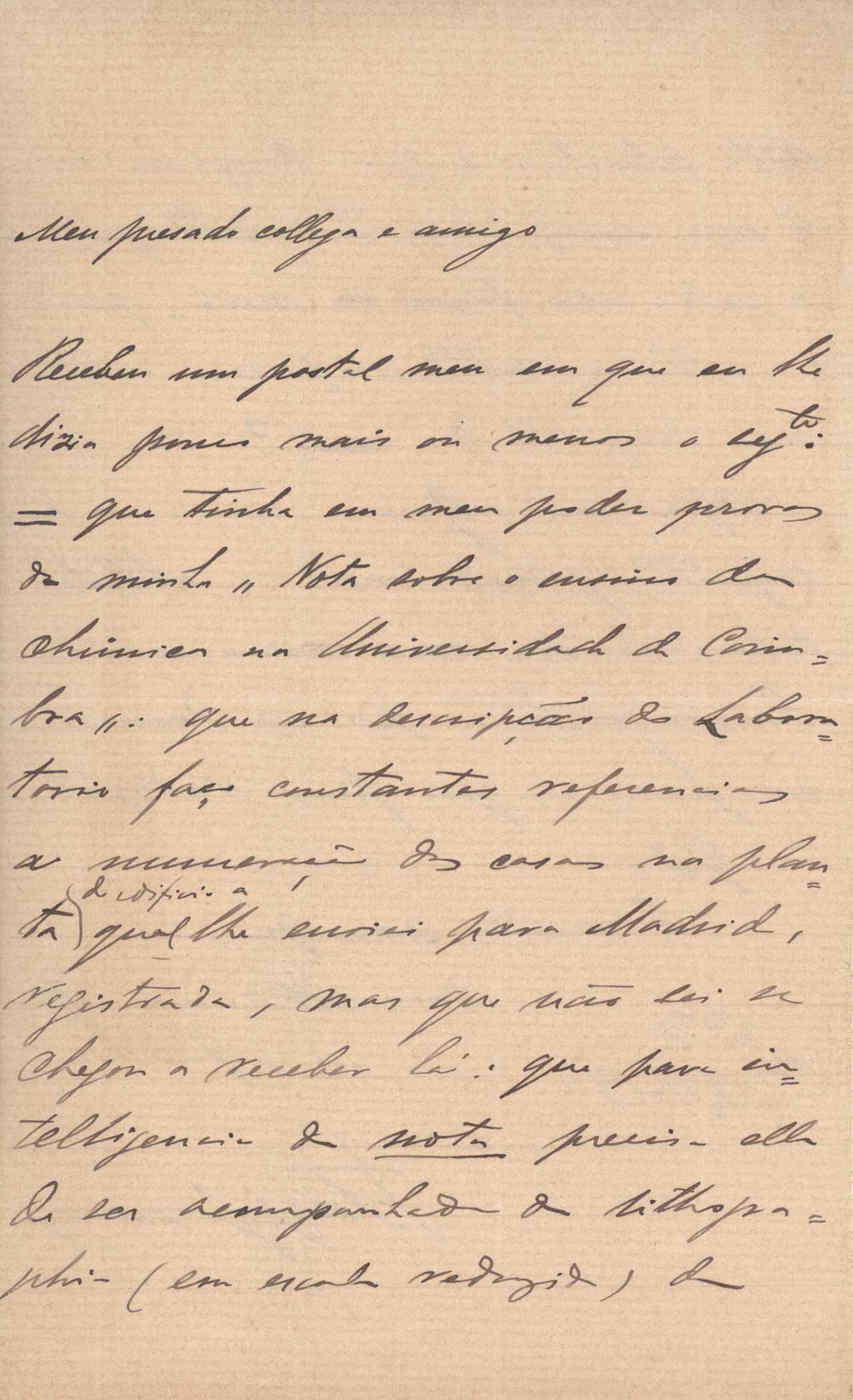 Instituição: Fundação Mário Soares e Maria Barroso Pasta: 07003.089Assunto: Provas de texto de Sousa Gomes intitulado "Nota sobre o ensino da química na Universidade de Coimbra", enviado para Bernardino Machado, em Madrid; planta do Laboratório e possibilidade de fazer litografia em MadridRemetente: Francisco Sousa GomesDestinatário: Bernardino MachadoData: Terça, 27 de Dezembro de 1892Fundo: DBG - Documentos Bernardino MachadoTipo Documental: CorrespondenciaDireitos: A publicação, total ou parcial, deste documento exige prévia autorização da entidade detentora.