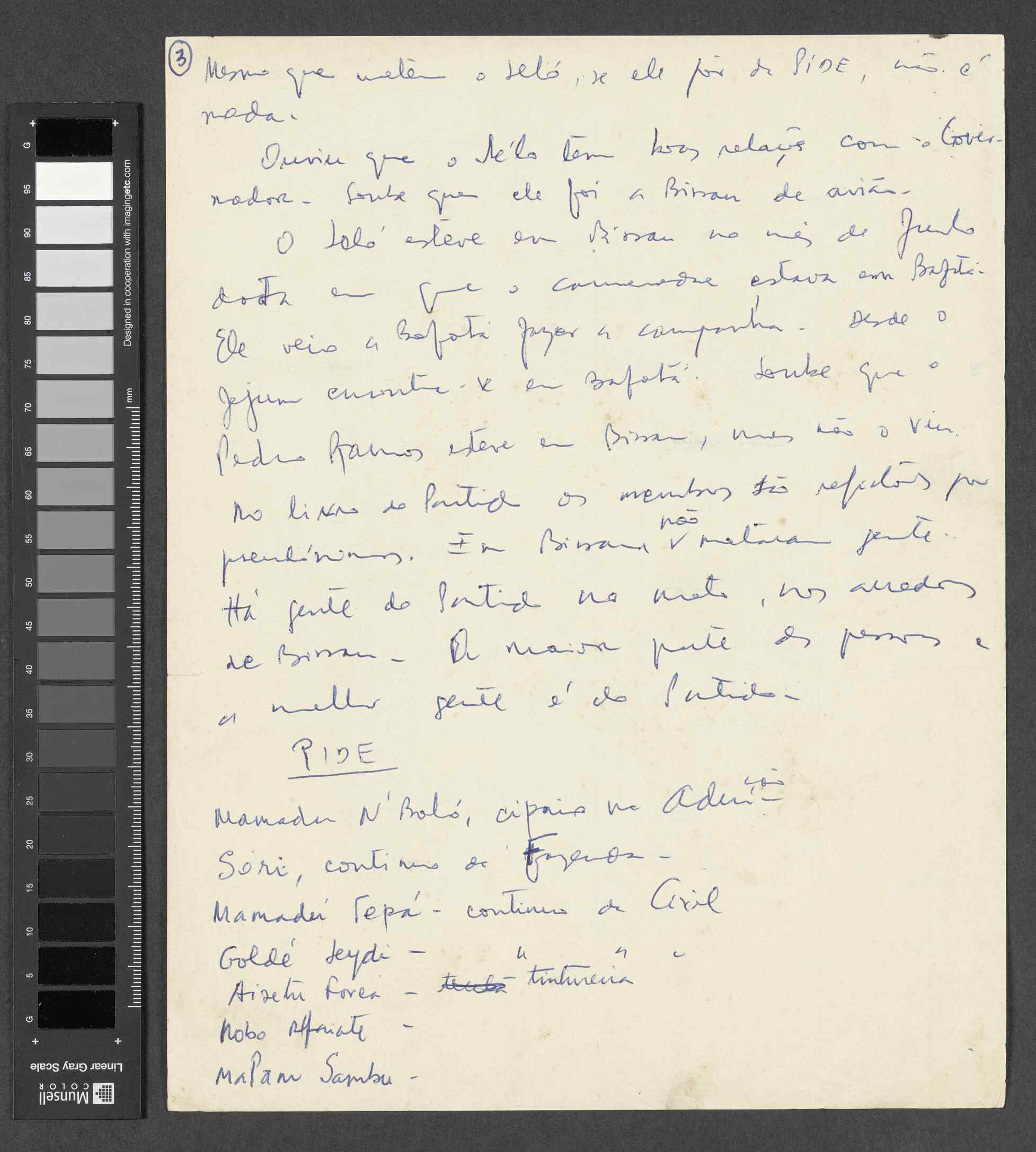 Instituição: Fundação Mário Soares e Maria Barroso Pasta: 07060.027.014Título: Informações de Bissau sobre a PIDEAssunto: Informações de Bissau sobre a PIDE incluindo uma lista de nomes de guineenses ao serviço da PIDE.Data: c. 1960Observações: Doc. Incluído no dossier intitulado Manuscritos de Amílcar Cabral.Fundo: DAC - Documentos Amílcar CabralTipo Documental: DocumentosDireitos: A publicação, total ou parcial, deste documento exige prévia autorização da entidade detentora.