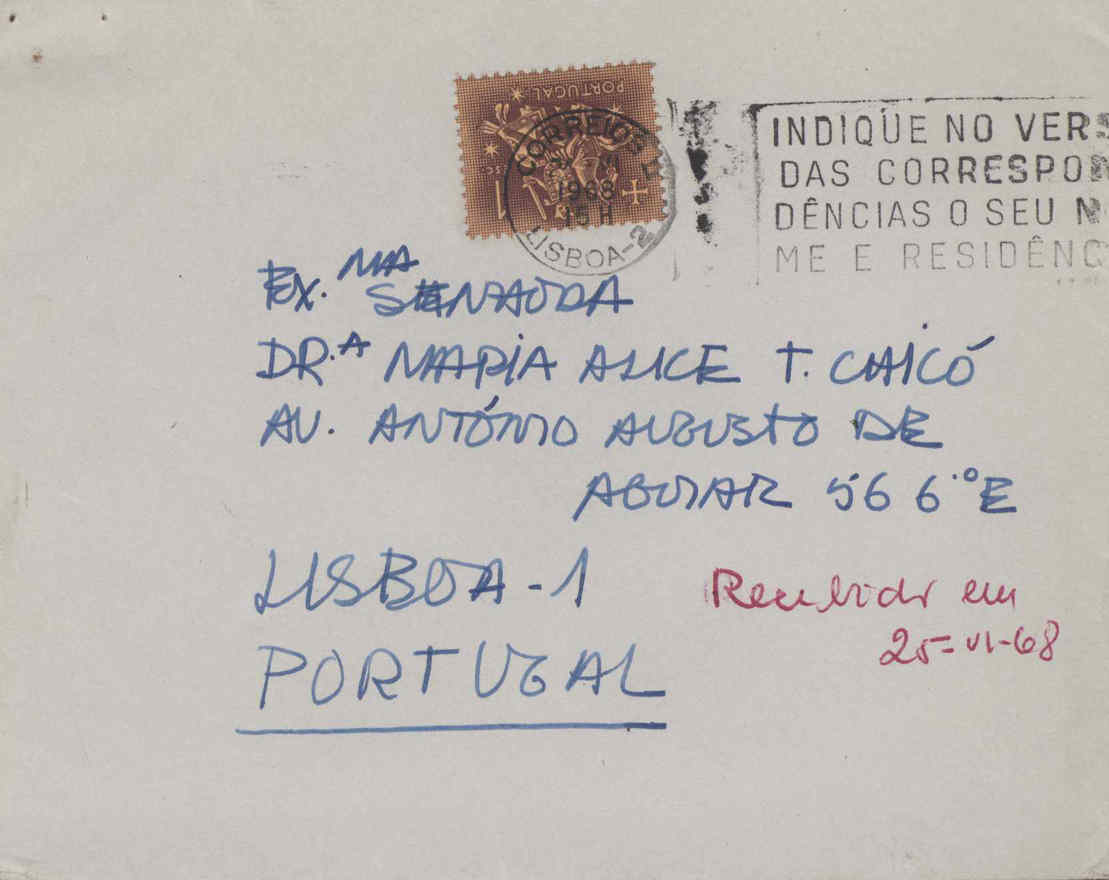 Instituição: Fundação Mário Soares e Maria Barroso Pasta: 07232.001.022Remetente: Sílvia ChicóDestinatário: Maria Alice ChicóData: Segunda, 27 de Maio de 1968Fundo: DTC - Documentos Mário e Alice ChicóTipo Documental: CorrespondenciaDireitos: A publicação, total ou parcial, deste documento exige prévia autorização da entidade detentora.