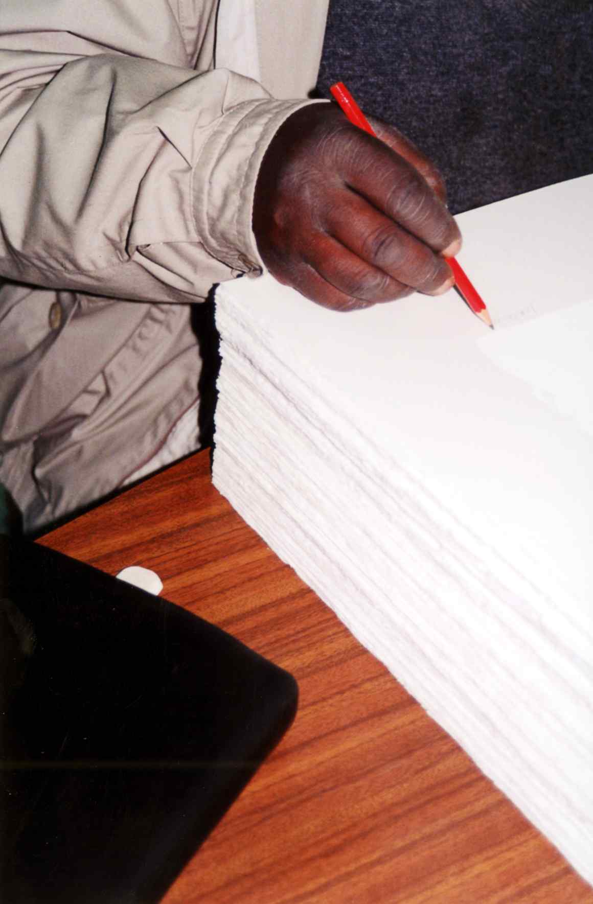 Instituições: Fundação Mário Soares e Maria Barroso Malangatana Valente Ngwenya Pasta: 07360.023.002Título: Retrato de Malangatana (pormenor da mão)Assunto: Fotografia de pormenor da mão de Malangatana assinando uma edição de serigrafias.Opaco/Transparente: OpacoNegativo/Positivo: PositivoPB/Cor: CorDimensões da Imagem: 10 x 15 cmFundo: DMT - Documentos MalangatanaTipo Documental: FotografiasDireitos: A publicação, total ou parcial, deste documento exige prévia autorização da entidade detentora.