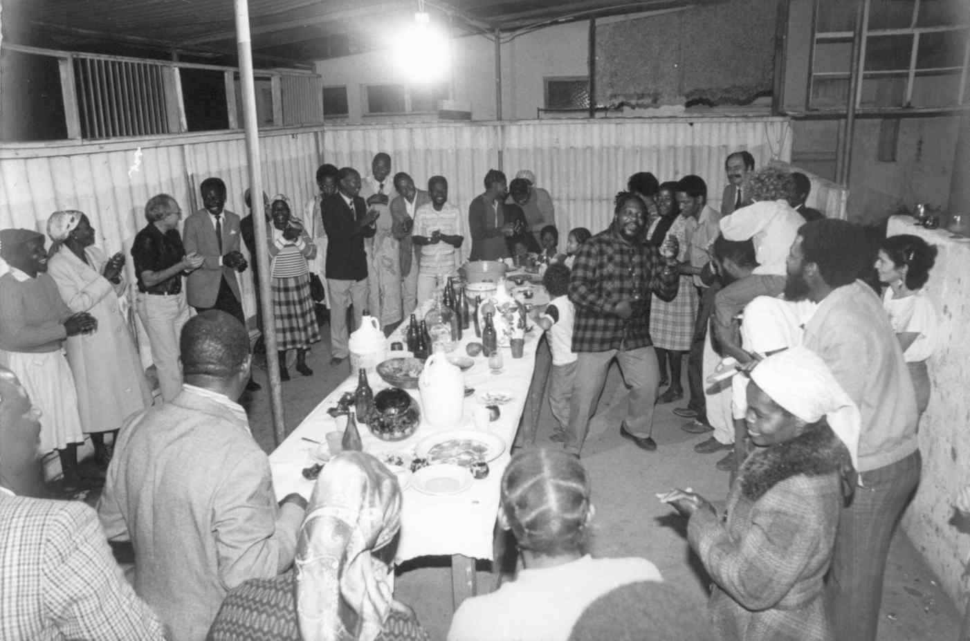 Instituições: Fundação Mário Soares e Maria Barroso Malangatana Valente Ngwenya Pasta: 07364.002.001Título: Núcleo de Arte de MaputoAssunto: Festa no Núcleo de Arte de Maputo durante a retrospectiva dos 25 anos de pintura e 50 anos natalícios de Malangatana celebrados em 1986.Autor: Jorge AlmeidaInscrições: Retrospectiva 1986 - Nucleo de ArteData: 1986Opaco/Transparente: OpacoNegativo/Positivo: PositivoPB/Cor: PBDimensões da Imagem: 11,8 x 17,8 cmFundo: DMT - Documentos MalangatanaTipo Documental: FotografiasDireitos: A publicação, total ou parcial, deste documento exige prévia autorização da entidade detentora.