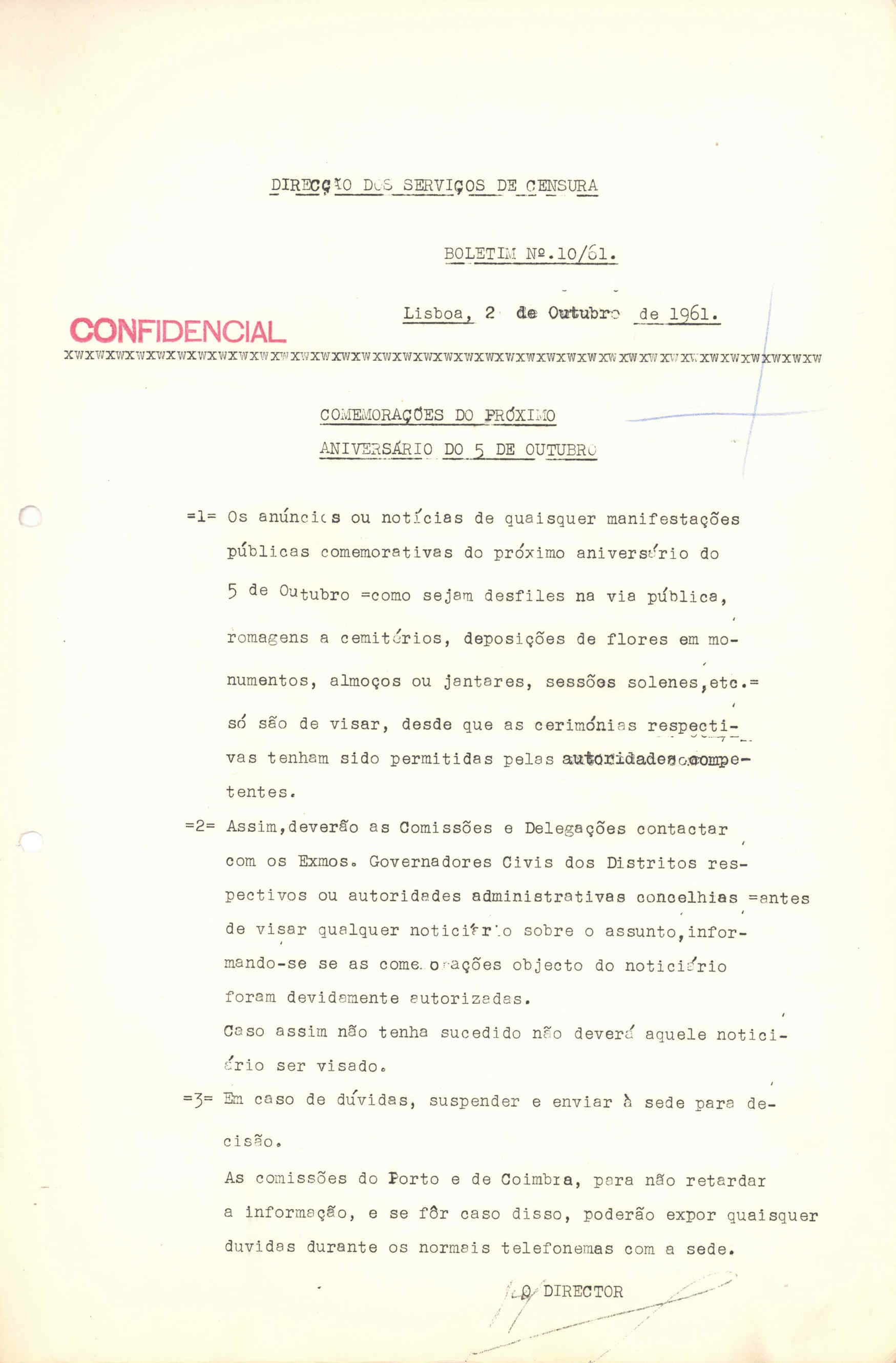 Instituição: Fundação Mário Soares e Maria Barroso Pasta: 07419.002.010Título: Boletim da Direcção dos Serviços de CensuraAssunto: Boletim n.º 10/61, confidencial, da Direcção dos Serviços de Censura com instruções sobre os anúncios e notícias de manifestações comemorativas do aniversário do 5 de Outubro.Data: Segunda, 2 de Outubro de 1961Fundo: DJL - Documentos João Soares LouroTipo Documental: DocumentosDireitos: A publicação, total ou parcial, deste documento exige prévia autorização da entidade detentora.
