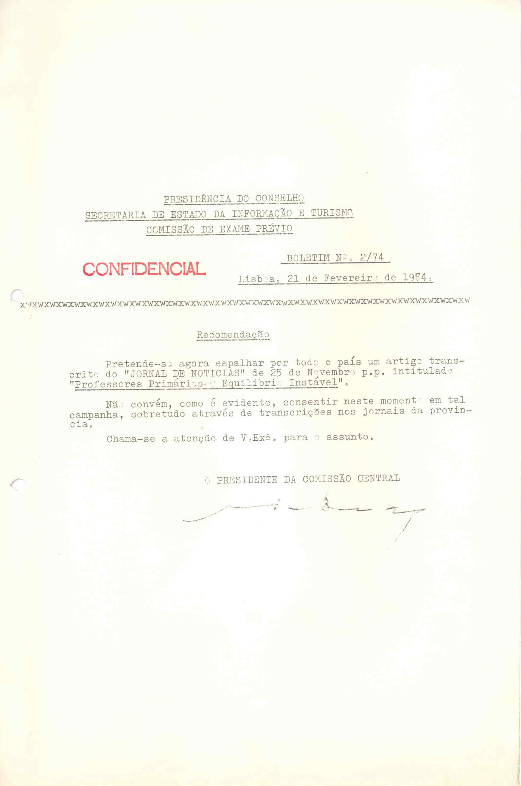 Instituição: Fundação Mário Soares e Maria Barroso Pasta: 07419.015.002Título: Boletim da Comissão de Exame PrévioAssunto: Boletim n.º 2/74, confidencial, da Comissão de Exame Prévio recomendando que não se consentisse a transcrição de um artigo inserto no Jornal de Notícias de 25.NOV.1973 intitulado "Professores Primários - Equilíbrio Instável".Data: Quinta, 21 de Fevereiro de 1974Fundo: DJL - Documentos João Soares LouroTipo Documental: DocumentosDireitos: A publicação, total ou parcial, deste documento exige prévia autorização da entidade detentora.