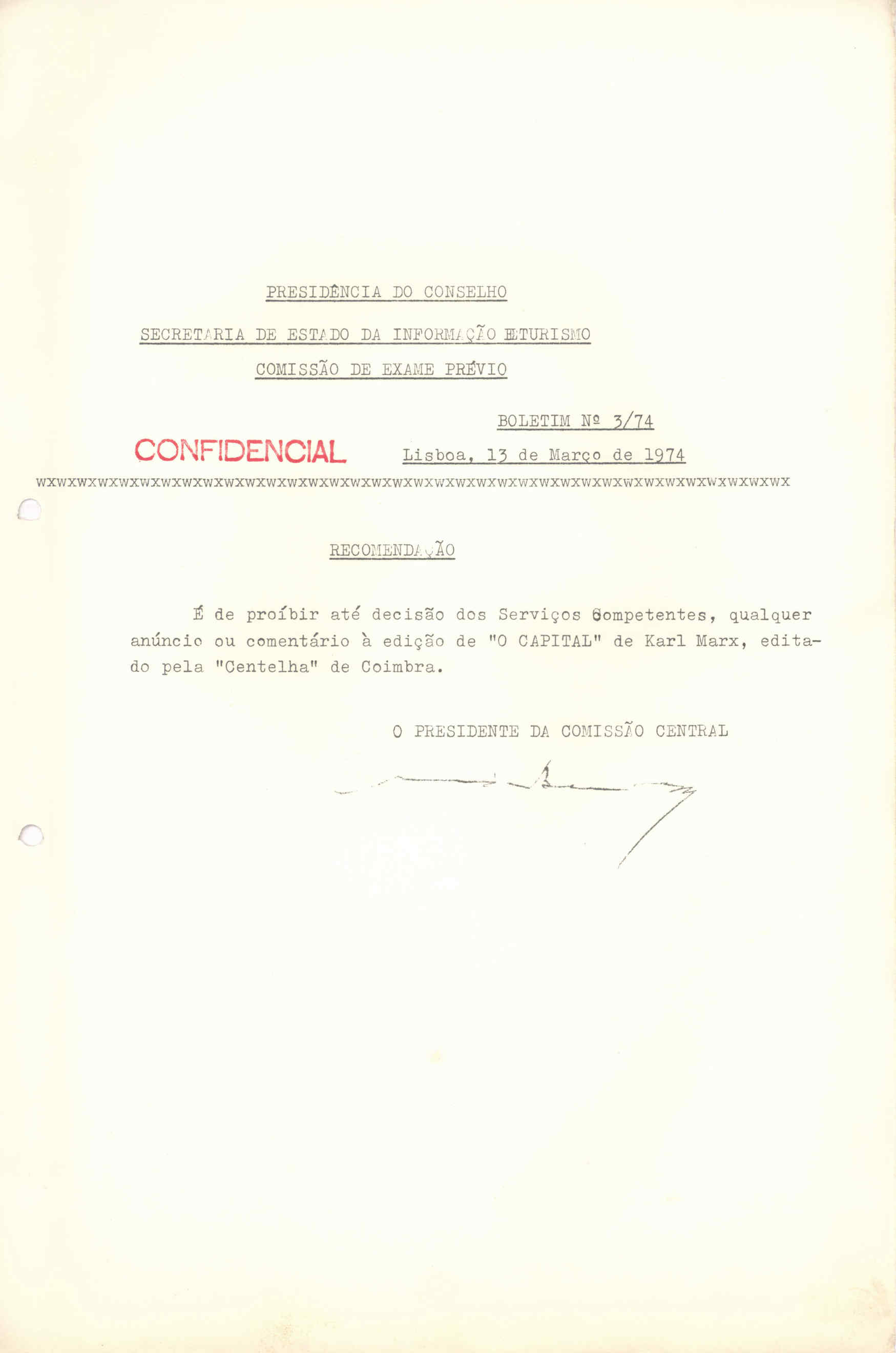 Instituição: Fundação Mário Soares e Maria Barroso Pasta: 07419.015.003Título: Boletim da Comissão de Exame PrévioAssunto: Boletim n.º 3/74, confidencial, da Comissão de Exame Prévio recomendando a proibição de qualquer anúncio ou comentário à edição de "O Capital" de Karl Marx, editada pela Centelha, de Coimbra.Data: Quarta, 13 de Março de 1974Fundo: DJL - Documentos João Soares LouroTipo Documental: DocumentosDireitos: A publicação, total ou parcial, deste documento exige prévia autorização da entidade detentora.