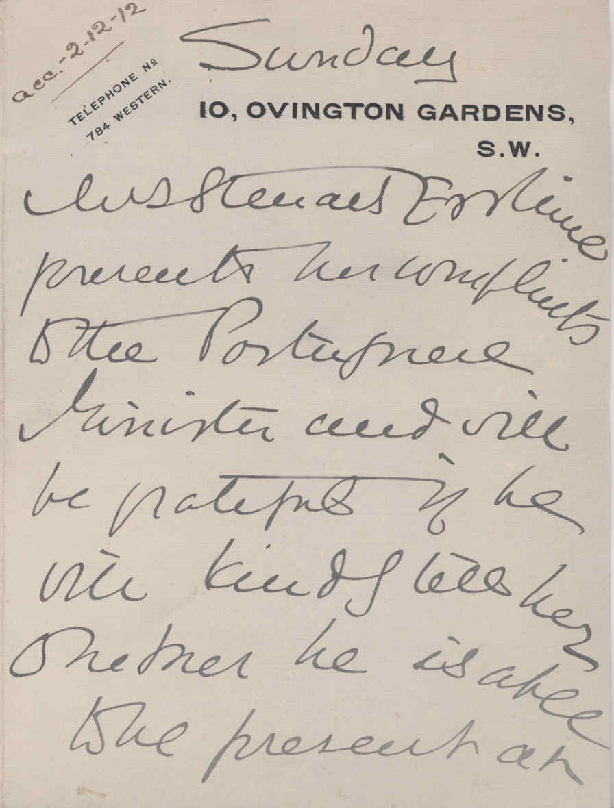 Instituição: Fundação Mário Soares e Maria Barroso Pasta: 08078.212Assunto: Convite a Teixeira Gomes para assistir a conferência sobre Portugal, no Lyceum Club, sobre a qual Steuart Erskine escrevera a Almeida Carvalho. Contém em anexo minuta da resposta de Teixeira Gomes.Remetente: Mrs. Steuart ErskineDestinatário: Manuel Teixeira GomesData: Segunda, 2 de Dezembro de 1912Observações: Beatrice Caroline Erskine, escitora, esposa de R. Steuart ErskineFundo: DTE - Documentos Manuel Teixeira GomesTipo Documental: CorrespondenciaDireitos: A publicação, total ou parcial, deste documento exige prévia autorização da entidade detentora.