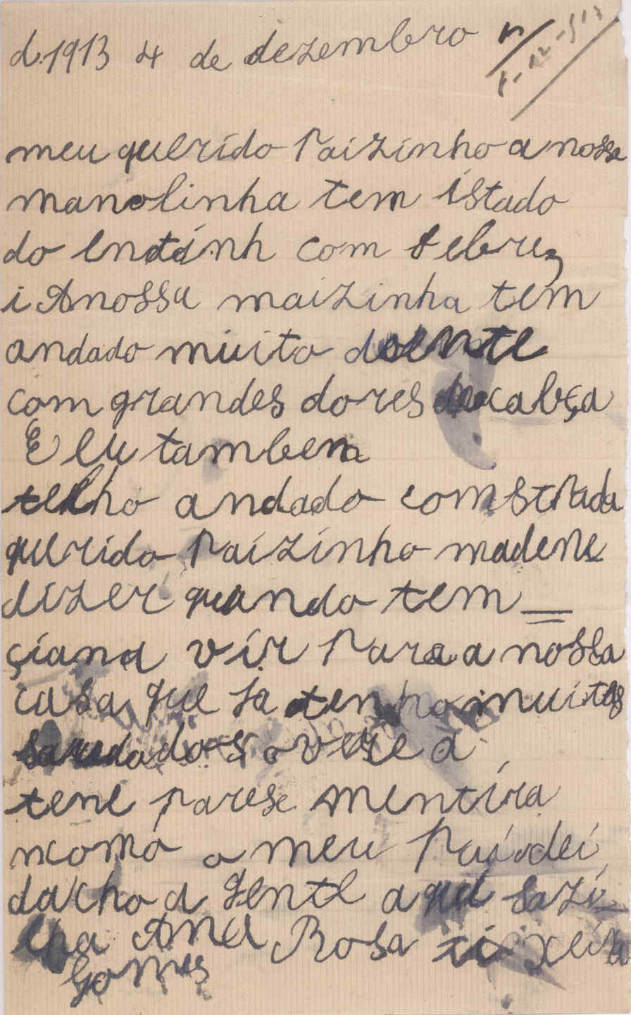 Instituição: Fundação Mário Soares e Maria Barroso Pasta: 08079.029Assunto: Carta de Ana Rosa, filha de Teixeira Gomes, sobre estado de saúde da mãe e da irmã Manuela.Remetente: Ana Rosa Teixeira GomesDestinatário: Manuel Teixeira GomesData: Quinta, 4 de Dezembro de 1913Observações: Filha de Manuel Teixeira GomesFundo: DTE - Documentos Manuel Teixeira GomesTipo Documental: CorrespondenciaDireitos: A publicação, total ou parcial, deste documento exige prévia autorização da entidade detentora.