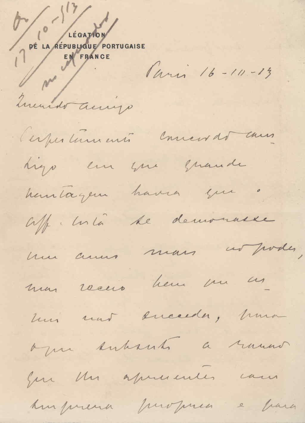 Instituição: Fundação Mário Soares e Maria Barroso Pasta: 08079.182Assunto: Refere concordar com Teixeira Gomes de que havia vantagem em que Afonso Costa se mantivesse mais um ano no poder. Manifesta confiança em Brito Camacho. Opinião de João Chagas sobre os sindicalistas. Estadia em Paris de António Macieira. Recepção de telegrama de Afonso Costa comunicando ter o Daily Telegraph publicado notícia de que nas bases do acordo hispano-francês figurava a hipótese de uma intervenção da Europa em Portugal. Violenta campanha em Lisboa contra Afonso Costa.Remetente: João Chagas, Legação de Portugal em FrançaDestinatário: Manuel Teixeira Gomes, Ministro de Portugal em LondresData: Domingo, 16 de Março de 1913Fundo: DTE - Documentos Manuel Teixeira GomesTipo Documental: CorrespondenciaDireitos: A publicação, total ou parcial, deste documento exige prévia autorização da entidade detentora.