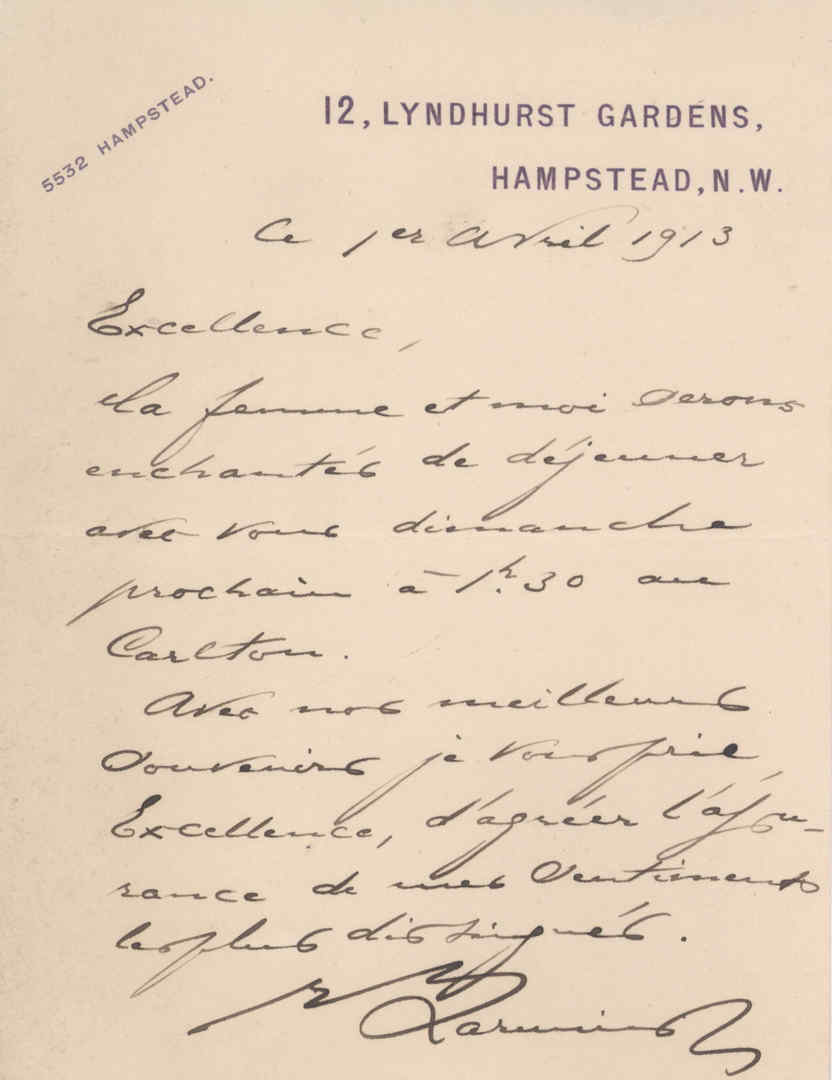 Instituição: Fundação Mário Soares e Maria Barroso Pasta: 08080.001Assunto: Informa que ele a mulher aceitavam convite de Teixeira Gomes para almoçar no Carlton.Remetente: KarminskiDestinatário: Manuel Teixeira GomesData: Terça, 1 de Abril de 1913Fundo: DTE - Documentos Manuel Teixeira GomesTipo Documental: CorrespondenciaDireitos: A publicação, total ou parcial, deste documento exige prévia autorização da entidade detentora.