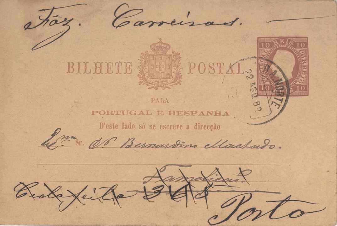 Instituição: Fundação Mário Soares e Maria Barroso Pasta: 08136.034Assunto: Bilhete postal referindo o envio para o Porto de uma carta destinada a Bernardino Machado. Bilhete remetido de Vinhas da Rainha, Soure.Destinatário: Bernardino MachadoData: Segunda, 21 de Agosto de 1882Observações: Assinatura do remetente por identificar.Fundo: Bernardino MachadoTipo Documental: CorrespondenciaDireitos: A publicação, total ou parcial, deste documento exige prévia autorização da entidade detentora.