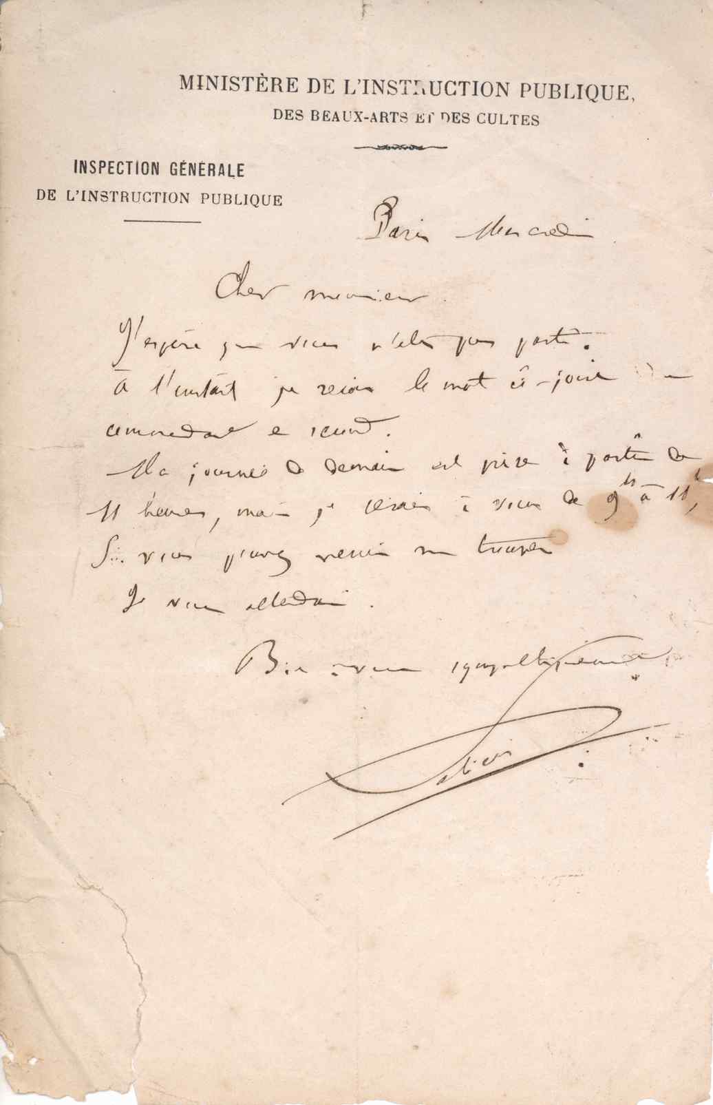 Instituição: Fundação Mário Soares e Maria Barroso Pasta: 08136.073Remetente: Felicis (?), Ministère de L'Instruction Publique, des Beaux-Arts et des Cultes, Inspection Générale de L'Instruction PubliqueDestinatário: Bernardino MachadoData: c. 1886Fundo: Bernardino MachadoTipo Documental: CorrespondenciaDireitos: A publicação, total ou parcial, deste documento exige prévia autorização da entidade detentora.