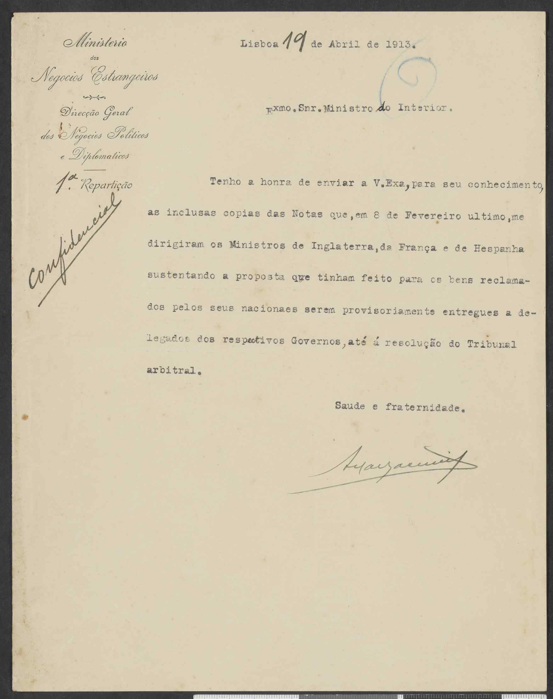 Instituição: Fundação Mário Soares e Maria Barroso Pasta: 09516.024Assunto: Ofício confidencial do Ministério dos Negócios Estrangeiros, Direcção Geral dos Negócios Políticos e Diplomáticos, enviando notas de 8 de Fevereiro de 1913 remetidas ao Ministro dos Negócios Estrangeiros, António Macieira Júnior, pelos Ministros de Inglaterra, França e Espanha, sobre bens reclamados pelos seus nacionais, expropriados após o decreto de 8 de Outubro de 1910. Contém em anexo: cópia impressa de nota n.º 330, do Ministro da Grã-Bretanha, Arthur H. Hardinge; cópia impressa de nota n.º 331, do Ministro da França, G. Saint-René Taillandier, cópia impressa de nota n.º 332, do Ministro de Espanha, Marquês de Villalobar.Remetente: Direcção Geral dos Negócios Políticos e Diplomáticos, Ministério dos Negócios EstrangeirosDestinatário: Ministro do InteriorData: Sábado, 19 de Abril de 1913Fundo: Rodrigo José RodriguesTipo Documental: CorrespondenciaDireitos: A publicação, total ou parcial, deste documento exige prévia autorização da entidade detentora.