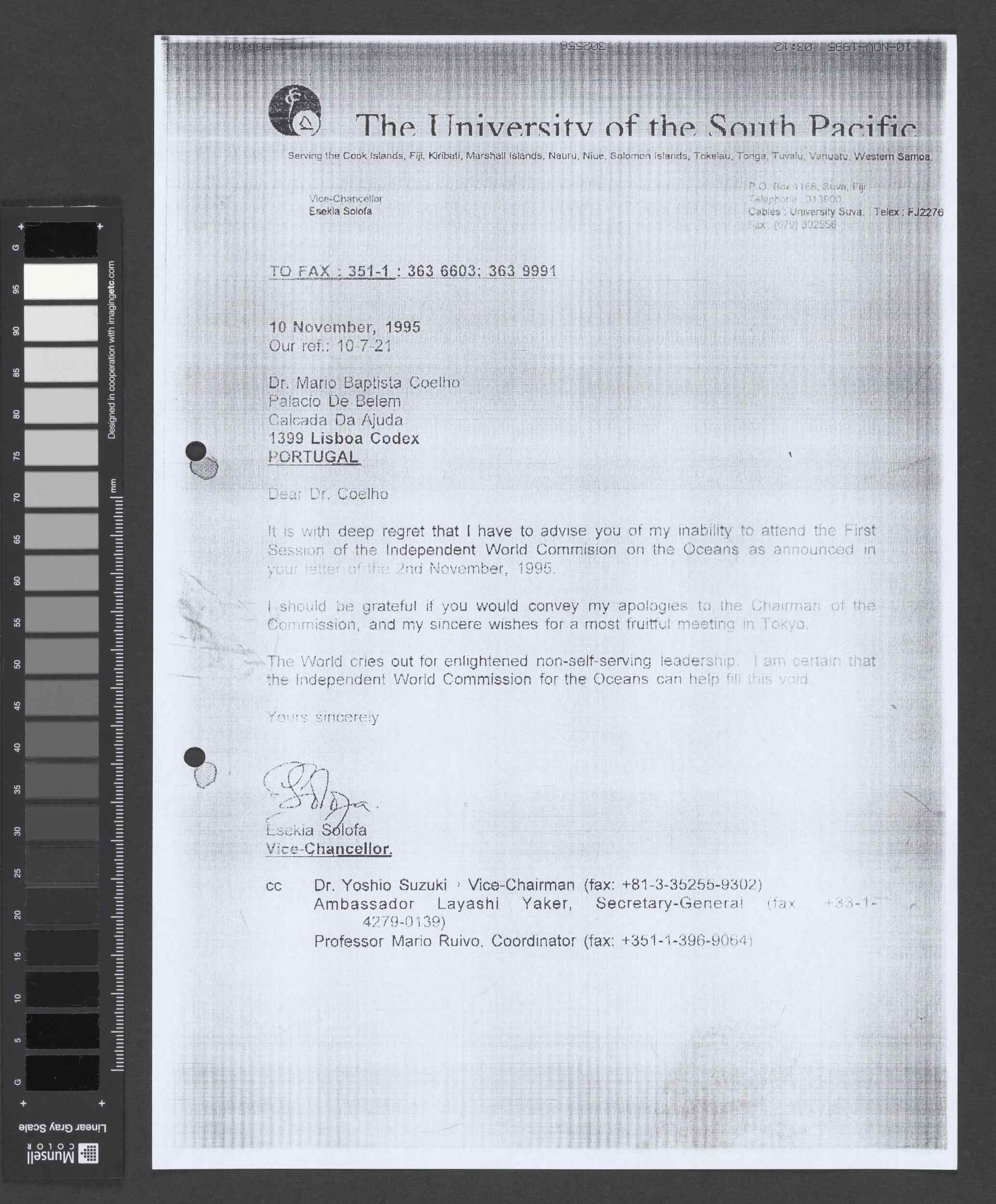 Instituição: Fundação Mário Soares e Maria Barroso Pasta: 10206.005.001Assunto: Fax de Esekia Solofa dirigido a Mário Coelho informando não poder estar presente na 1ª Sessão Plenária da CMIO, depositando esperança na liderança altruísta da CMIO.Remetente: Esekia SolofaDestinatário: Mário Baptista CoelhoData: sexta, 10 de novembro de 1995Fundo: Comissão Mundial Independente para os OceanosTipo Documental: CorrespondenciaLíngua do Documento: InglêsDireitos: A publicação, total ou parcial, deste documento exige prévia autorização da entidade detentora.