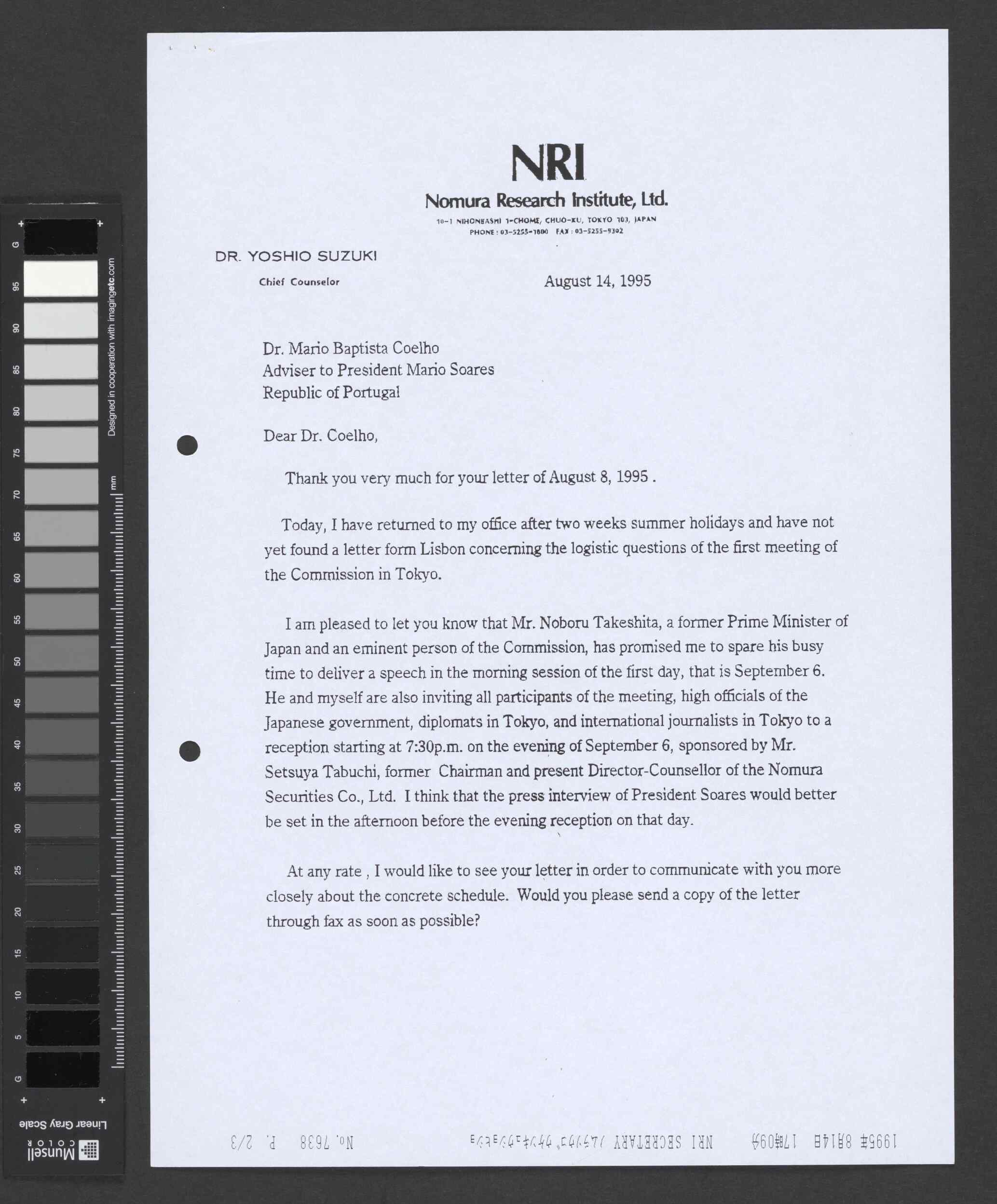 Instituição: Fundação Mário Soares e Maria Barroso Pasta: 10206.019.023Assunto: Fax de Yoshio Suzuki dirigido a Mário Baptista Coelho comunicando que o Primeiro-Ministro do Japão e pessoa eminente da CMIO irá discursar no primeiro dia da 1ª Sessão Plenária da CMIO.Remetente: Yoshio SuzukiDestinatário: Mário Baptista CoelhoData: terça, 15 de agosto de 1995Fundo: Comissão Mundial Independente para os OceanosTipo Documental: CorrespondenciaLíngua do Documento: InglêsDireitos: A publicação, total ou parcial, deste documento exige prévia autorização da entidade detentora.