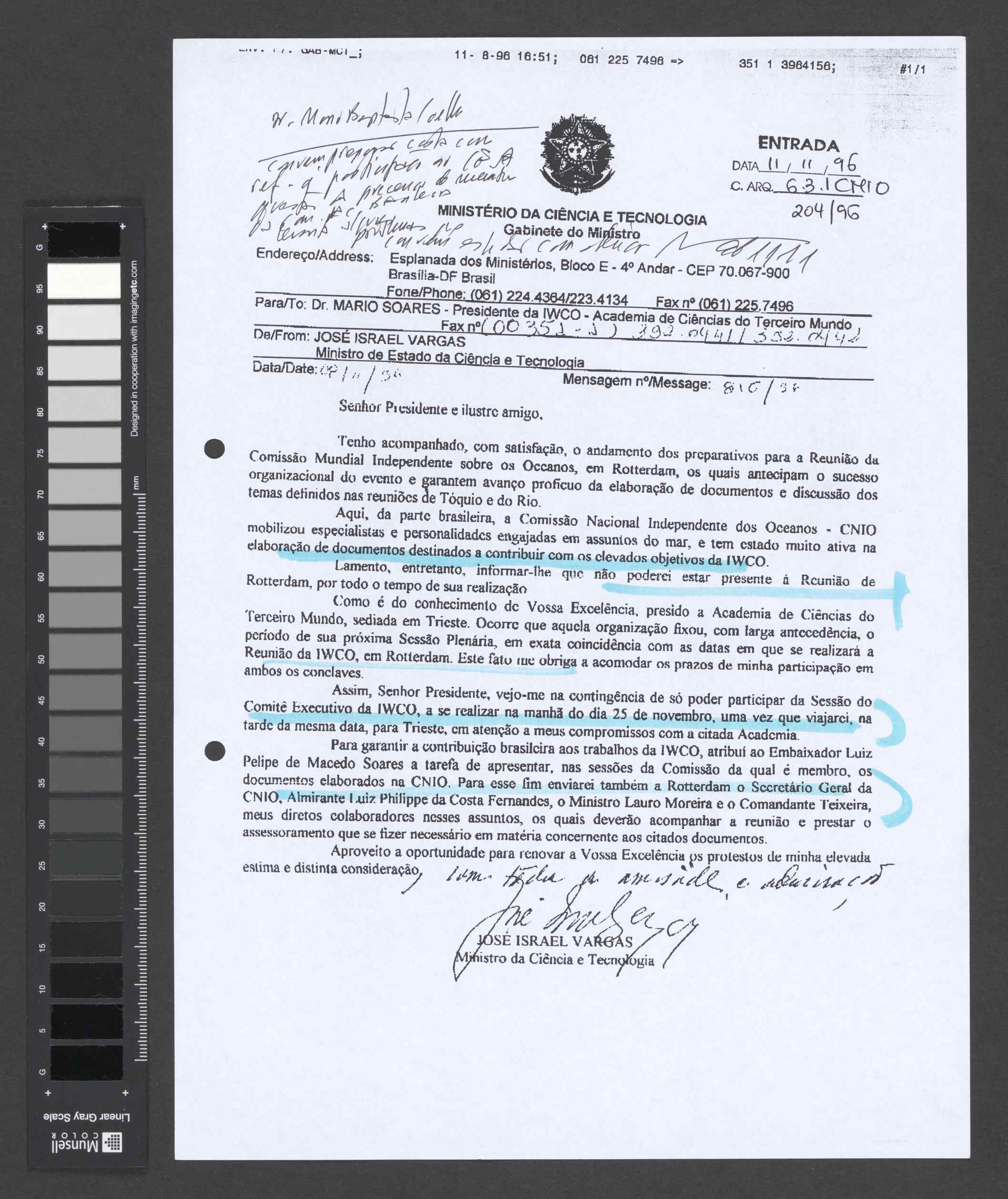 Instituição: Fundação Mário Soares e Maria Barroso Pasta: 10208.012.010Assunto: Fax do Ministro José Israel Vargas dirigido a Mário Soares sobre os preparativos da 3ª Sessão Plenária da CMIO em Roterdão, tendo delegado no embaixador Luiz Filipe de Macedo Soares a tarefa de apresentar os documentos elaborados pela Comissão Nacional Independente dos Oceanos (CNIO). Informa que enviou a Roterdão o Almirante Luiz Philippe Costa Fernandes, o Ministro Lauro Moreira e o Comandante Teixeira.Remetente: José Israel VargasDestinatário: Mário SoaresData: segunda, 11 de novembro de 1996Fundo: Comissão Mundial Independente para os OceanosTipo Documental: CorrespondenciaLíngua do Documento: PortuguêsDireitos: A publicação, total ou parcial, deste documento exige prévia autorização da entidade detentora.
