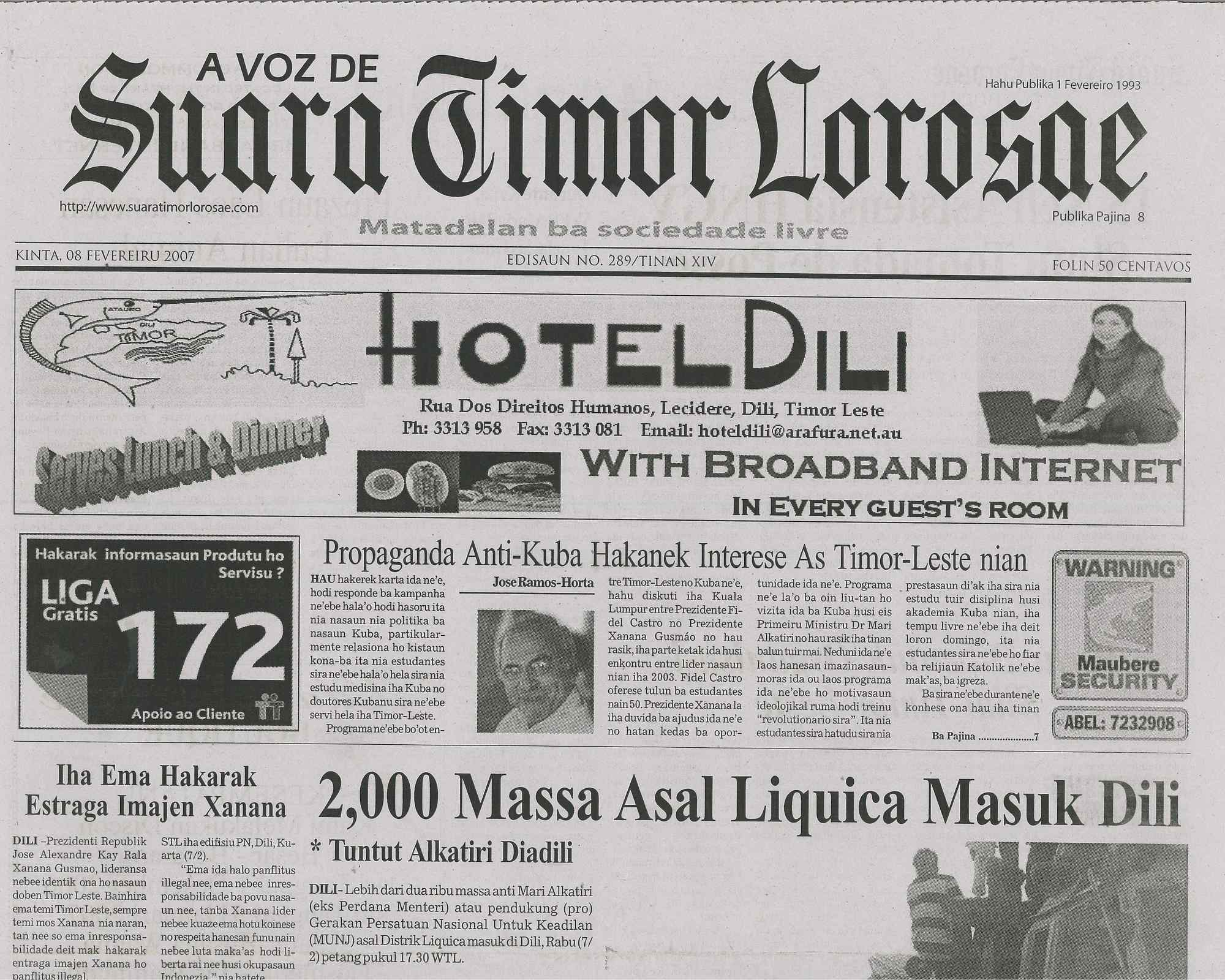 (2007), "Suara Timor Lorosae", Quinta, 8 de Fevereiro de 2007, Fundação Mário Soares / Arquivo da Resistência Timorense - Jornais Timor Telecom, Disponível HTTP: http://www.casacomum.org/cc/visualizador?pasta=10275.028 (2025-12-26)