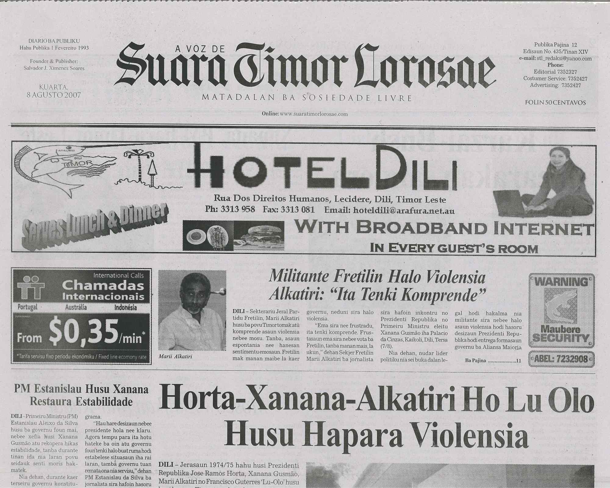 Instituição: Arquivo & Museu da Resistência Timorense Pasta: 10275.115Título: Suara Timor LorosaeData: Quarta, 8 de Agosto de 2007Observações: anúncio na pág. 1; anúncio na pág. 3; Fundo: Arquivo da Resistência Timorense - Jornais Timor TelecomTipo Documental: IMPRENSACota Original: STL_2007_08_08Direitos: A publicação, total ou parcial, deste documento exige prévia autorização da entidade detentora.