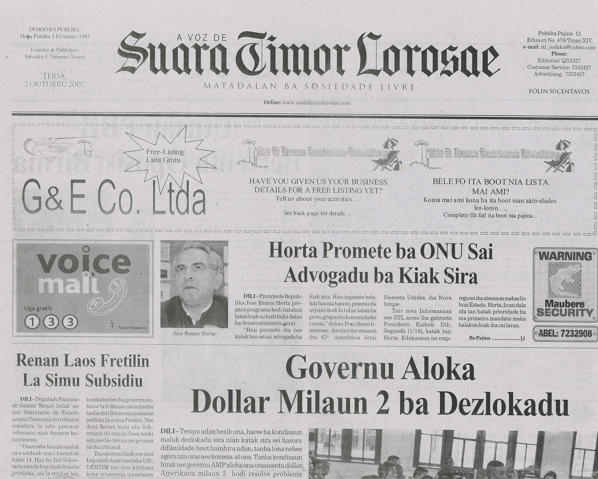 Instituição: Arquivo & Museu da Resistência Timorense Pasta: 10275.153Título: Suara Timor LorosaeData: Terça, 2 de Outubro de 2007Observações: anúncio na pág. 1; anúncio na pág. 3; Fundo: Arquivo da Resistência Timorense - Jornais Timor TelecomTipo Documental: IMPRENSACota Original: STL_2007_10_02Direitos: A publicação, total ou parcial, deste documento exige prévia autorização da entidade detentora.