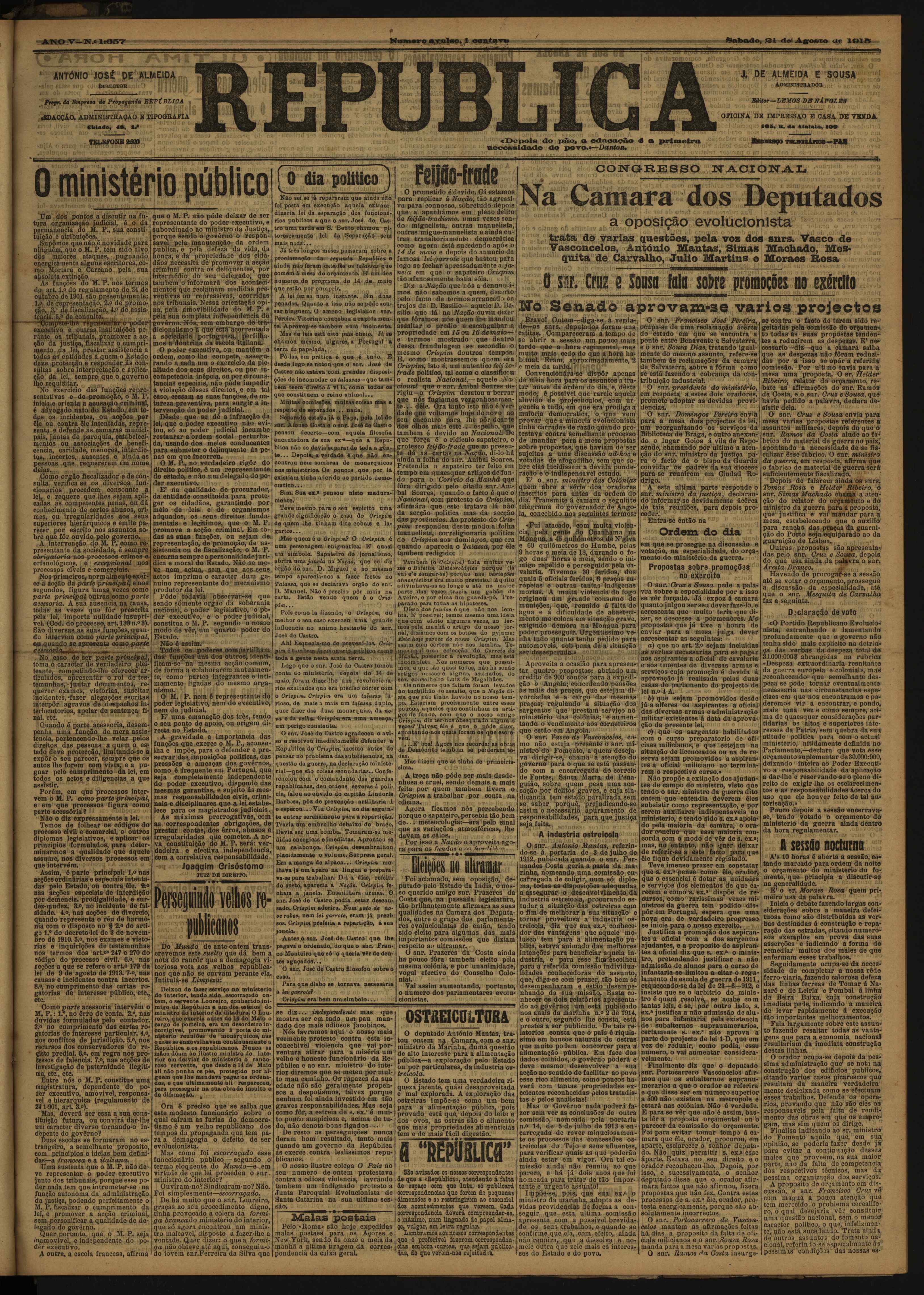 (1915), "República", nº 1657, Ano V, Sábado, 21 de Agosto de 1915, Fundação Mário Soares / Vasco Vieira de Almeida, Disponível HTTP: http://www.casacomum.org/cc/visualizador?pasta=10447.052 (2025-12-24)
