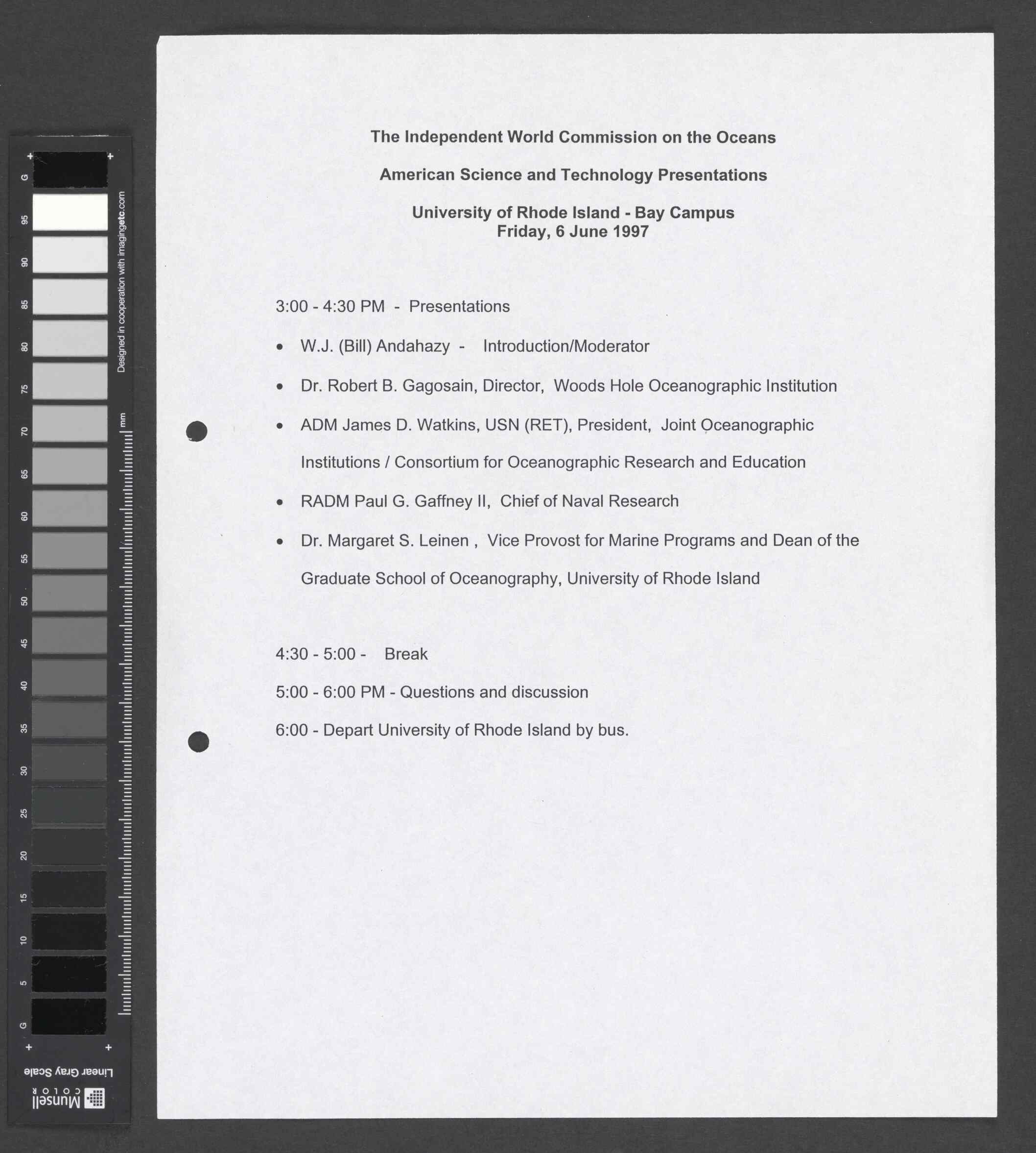Instituição: Fundação Mário Soares e Maria Barroso Pasta: 10654.004.003Assunto: Lista da escala apresentações da 4ª Sessão Plenária da CMIO em Newport.Data: c. Junho de 1997Observações: Documento incluído em separador intitulado "Miscellaneous/Documents Session".Fundo: Comissão Mundial Independente para os OceanosTipo Documental: DocumentosLíngua do Documento: InglêsDireitos: A publicação, total ou parcial, deste documento exige prévia autorização da entidade detentora.