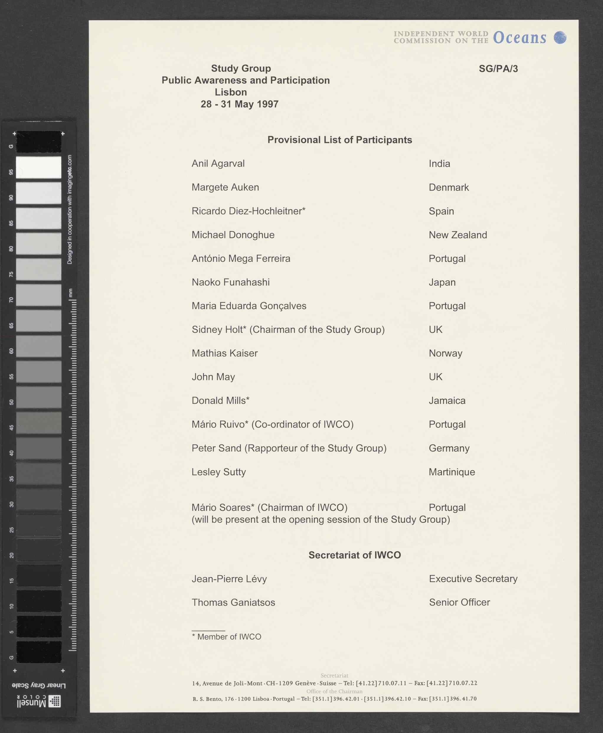 (1997), "Study Group Public Awareness and Participation. Provisional List of Participants", Fundação Mário Soares / Comissão Mundial Independente para os Oceanos, Disponível HTTP: http://www.casacomum.org/cc/visualizador?pasta=10665.004.004 (2025-12-24)