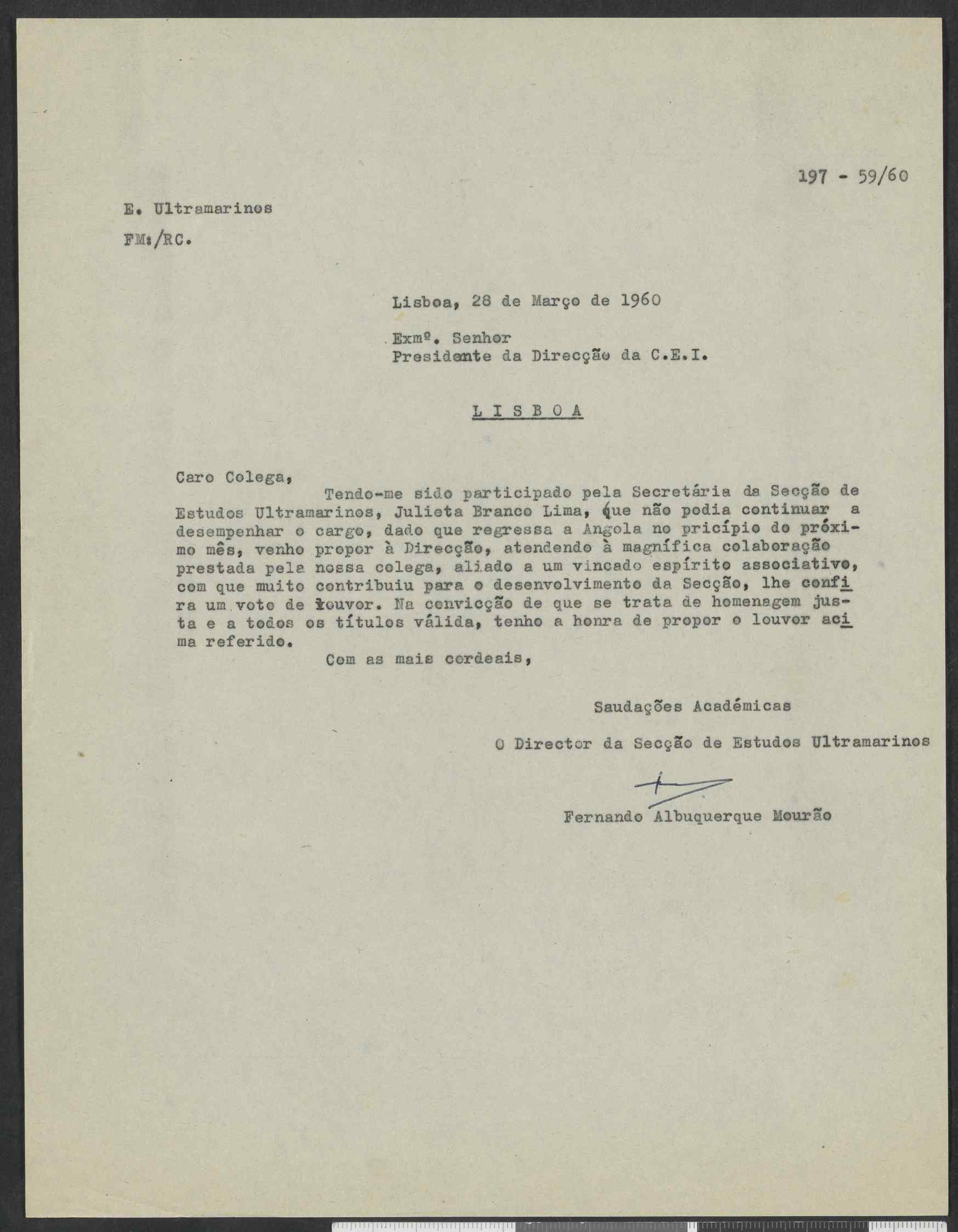 Pasta: 11121.003.007Assunto: Cópia de carta de Fernando Albuquerque Mourão, Director da Secção de Estudos Ultramarinos, para o Presidente da Direcção da Casa dos Estudantes do Império. Sugestão para se conferir voto de louvor à funcionária Julieta Branco Lima, que iria regressar a Angola.Remetente: Fernando Albuquerque Mourão, Director da SEUDestinatário: Presidente da Direcção da CEIData: Segunda, 28 de Março de 1960Fundo: Associação Casa dos Estudantes do ImpérioTipo Documental: CorrespondenciaDireitos: A publicação, total ou parcial, deste documento exige prévia autorização da entidade detentora.