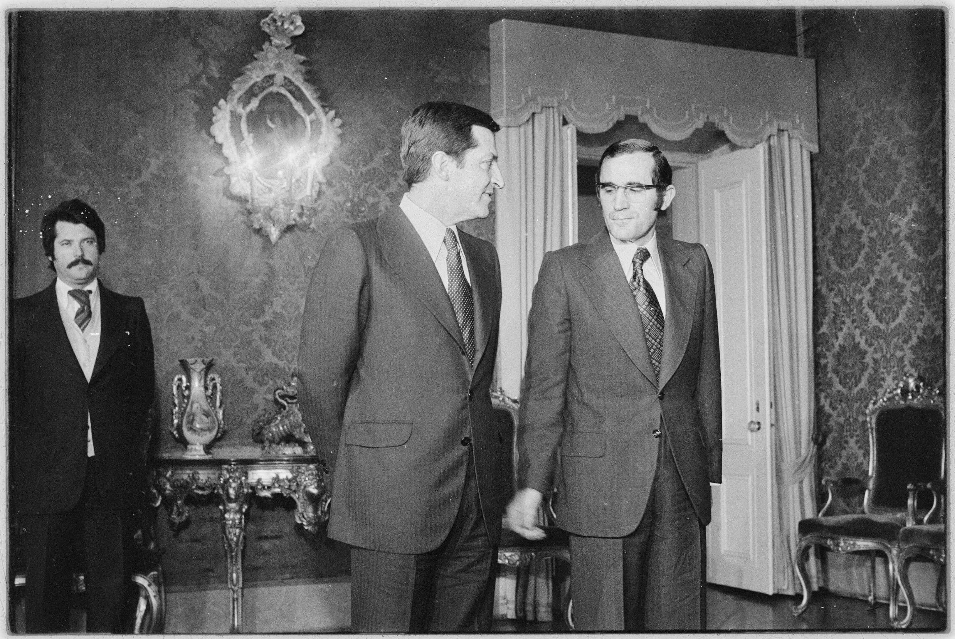 Pasta: 12277.035.023Assunto: Visita oficial de Adolfo Suárez, primeiro-ministro de Espanha, a Portugal. Adolfo Suárez e António Ramalho Eanes, Presidente da República, no Palácio de Belém.Autor: Inácio LudgeroInscrições: Inácio LudgeroData: quarta, 24 de novembro de 1976Opaco/Transparente: TransparenteNegativo/Positivo: NegativoPB/Cor: Preto e brancoAutor da reprodução: António CoelhoFundo: Inácio LudgeroTipo Documental: FotografiasDireitos: A publicação, total ou parcial, deste documento exige prévia autorização da entidade detentora.